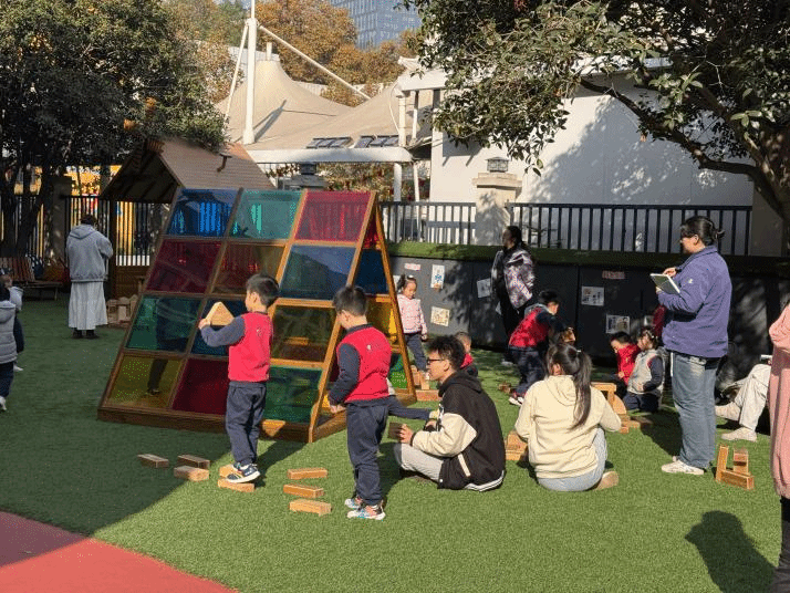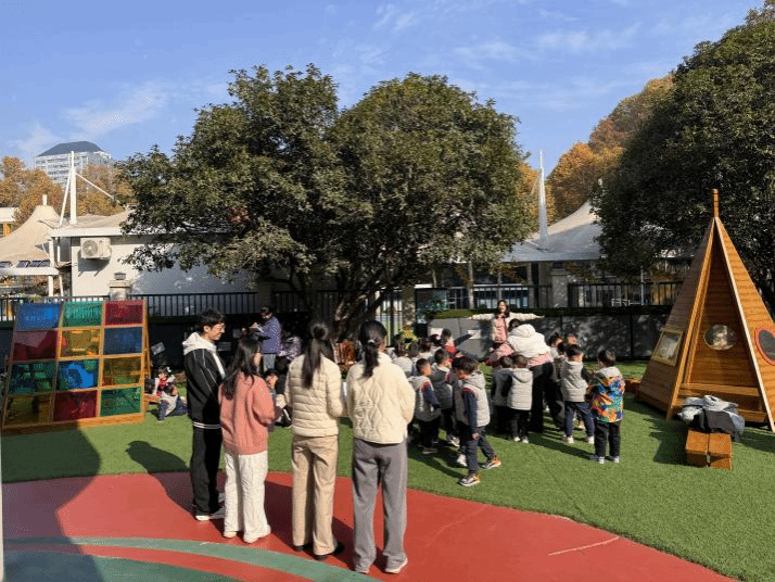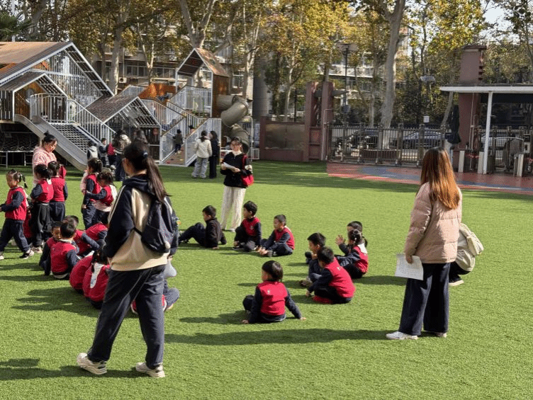 学生们在草坪上,观察围坐的幼儿,有的走动记录,老师在旁引导,把课堂搬到户外,让观察学习更鲜活。