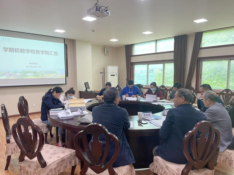 教育学院融媒体中心讯(通讯员 杨广泽 周琰)为全面了解教师教学和学生学习状况,进一步规范教育教学管理工作,切实保障本科教学高质量运行,2022年4月14日上午,由张隆胜、郑晓边、高秉雄、杨九民组成的学校督导专家组一行到我院进行学期初教学检查工作。我院教学副院长田友谊、副书记黄玉新、学前教育系负责人吴航、特殊教育系负责人徐添喜、教育经济与管理研究所负责人马红梅、本科教学秘书高晓智等参加此次检查工作。