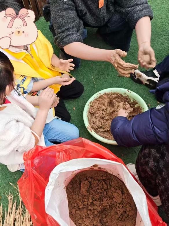 大三班以“春泥”为主题,开展了为期一周的自然花园系列活动。期间,孩子们参与多项泥土游戏:用彩色泥浆进行扎染与创意绘画;模仿同伴姿态捏制泥塑小人;将湿泥作为“泥巴炸弹”砸向画板进行创作。班级还组织了“春泥藏宝”活动,幼儿用泥巴包裹宝物藏于花园中,再集体开展寻宝游戏。实习老师朱思雨认为,孩子们在与泥土的亲密接触中充分释放了天性,展现出丰富的想象力与创造力。
