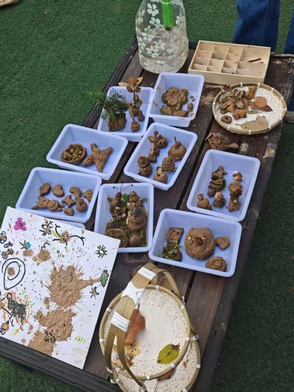 上周五,班级同步举办了亲子互动环节,家长与孩子共同捏制立体泥塑作品。孩子们直观感受泥土干湿程度对塑形的影响,参与者不仅使用教师准备的橡果、树叶等材料装饰作品,还自主前往草坪捡拾花穗等自然素材,完成泥塑创作。实习老师蔡宸颍感慨道:“亲子合作的泥塑创作既增进了情感交流,也让孩子更加亲近自然、热爱自然。”