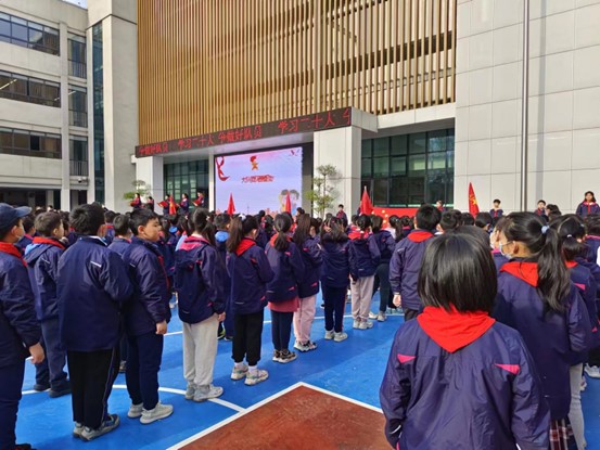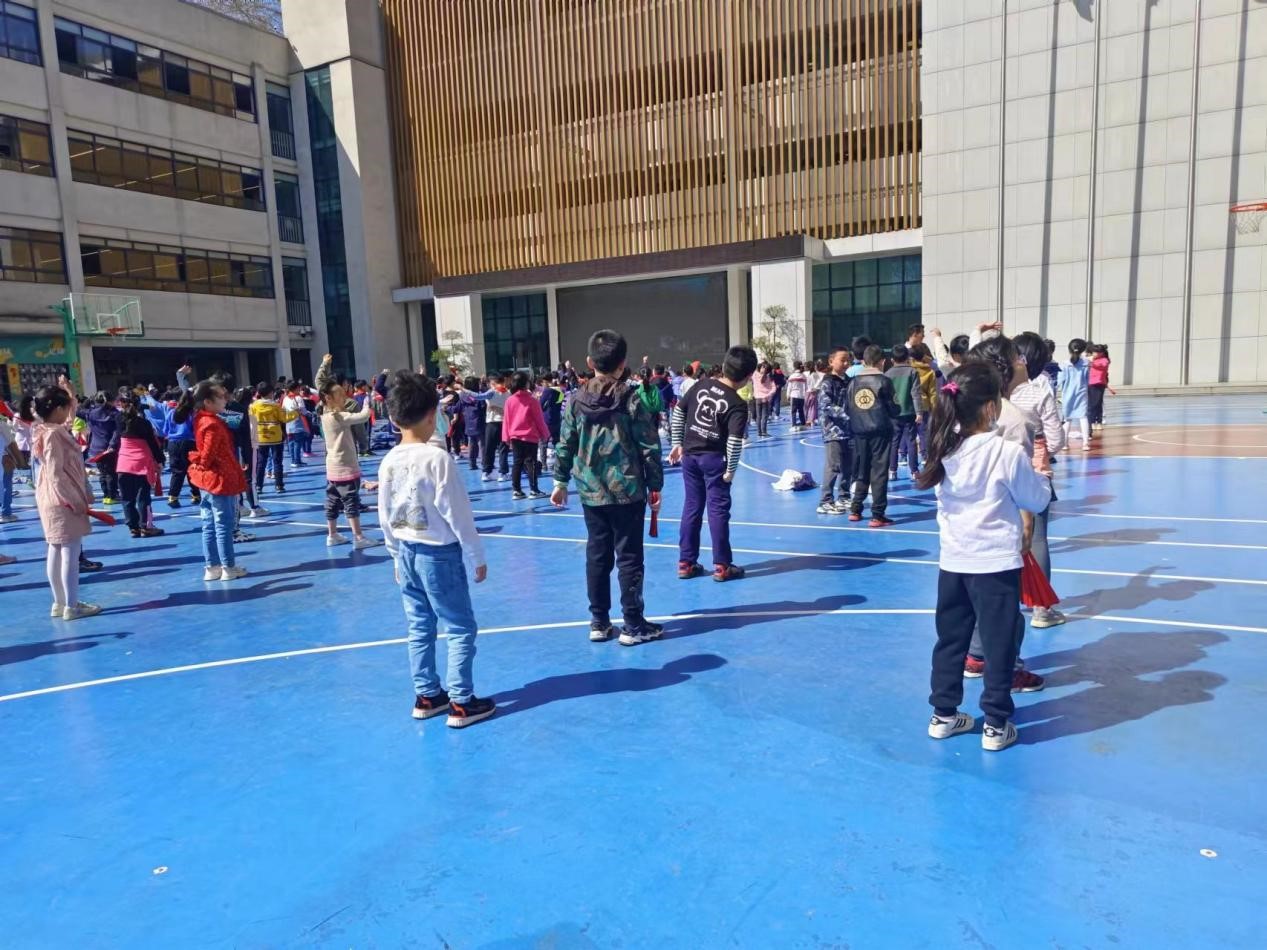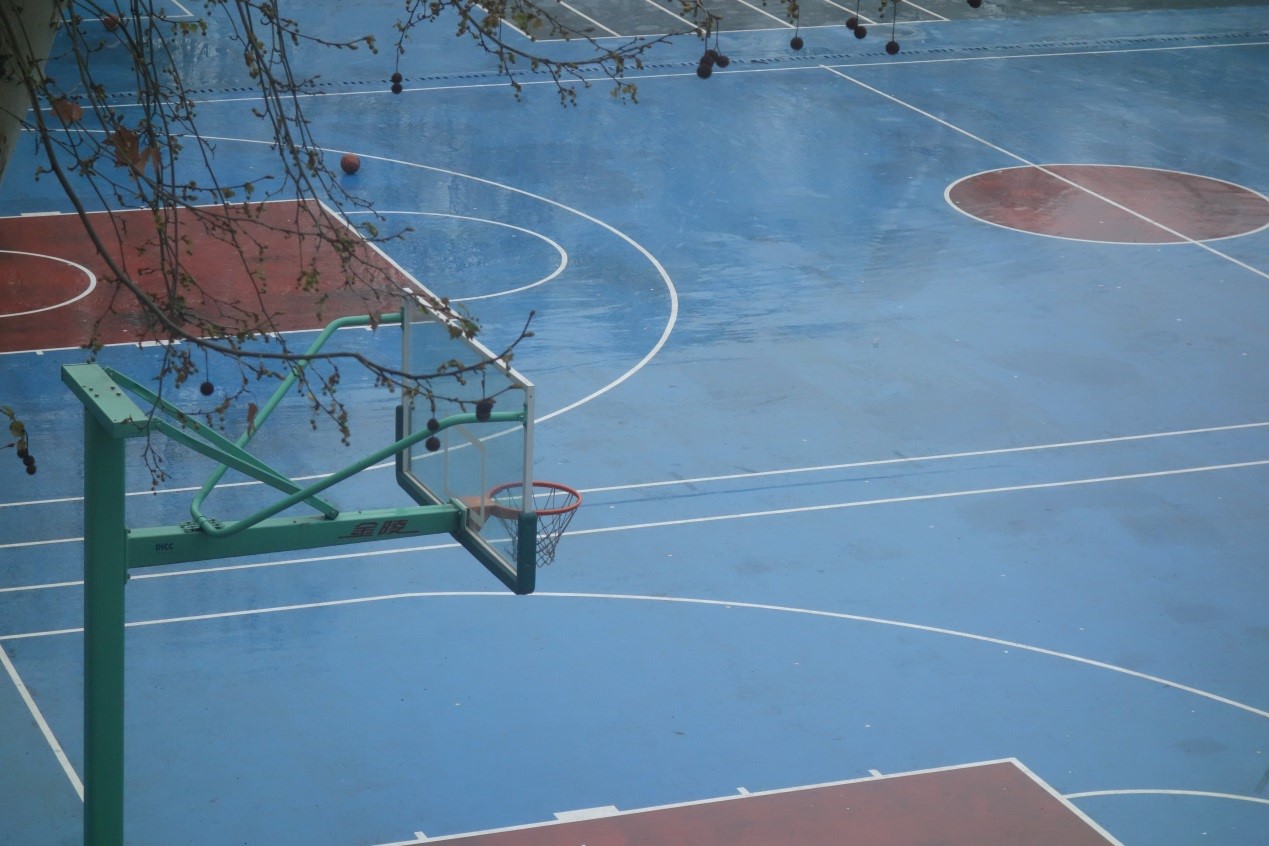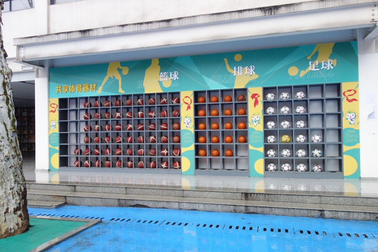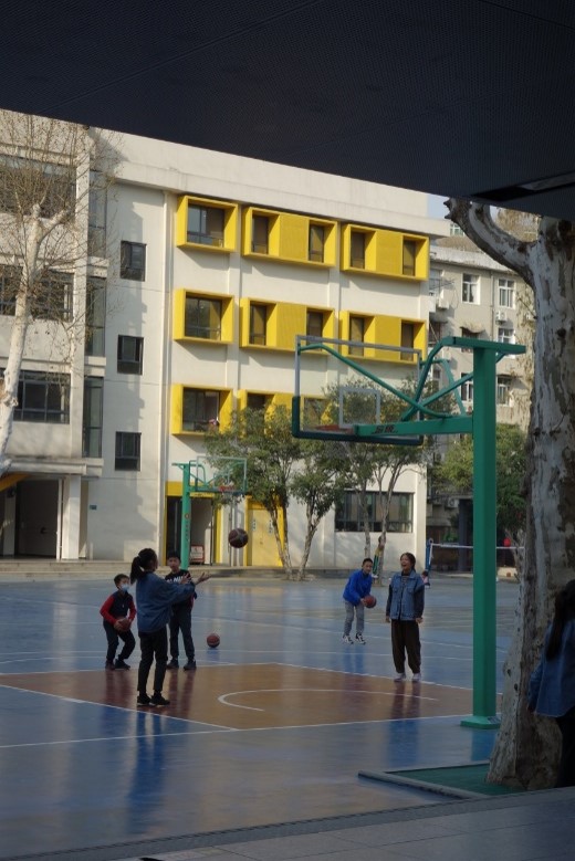 学校的各种球类设施就放在篮球场旁边的架子上,同学们随用随取,收拾得整洁干净。每每课间可以看到同学们在这边打球,玩耍,充分伸展身体,也会在这两个操场上进行每天的大课间——中间的升旗台放做操视频,同学们跟着运动,大约有半个小时,非常欢快。