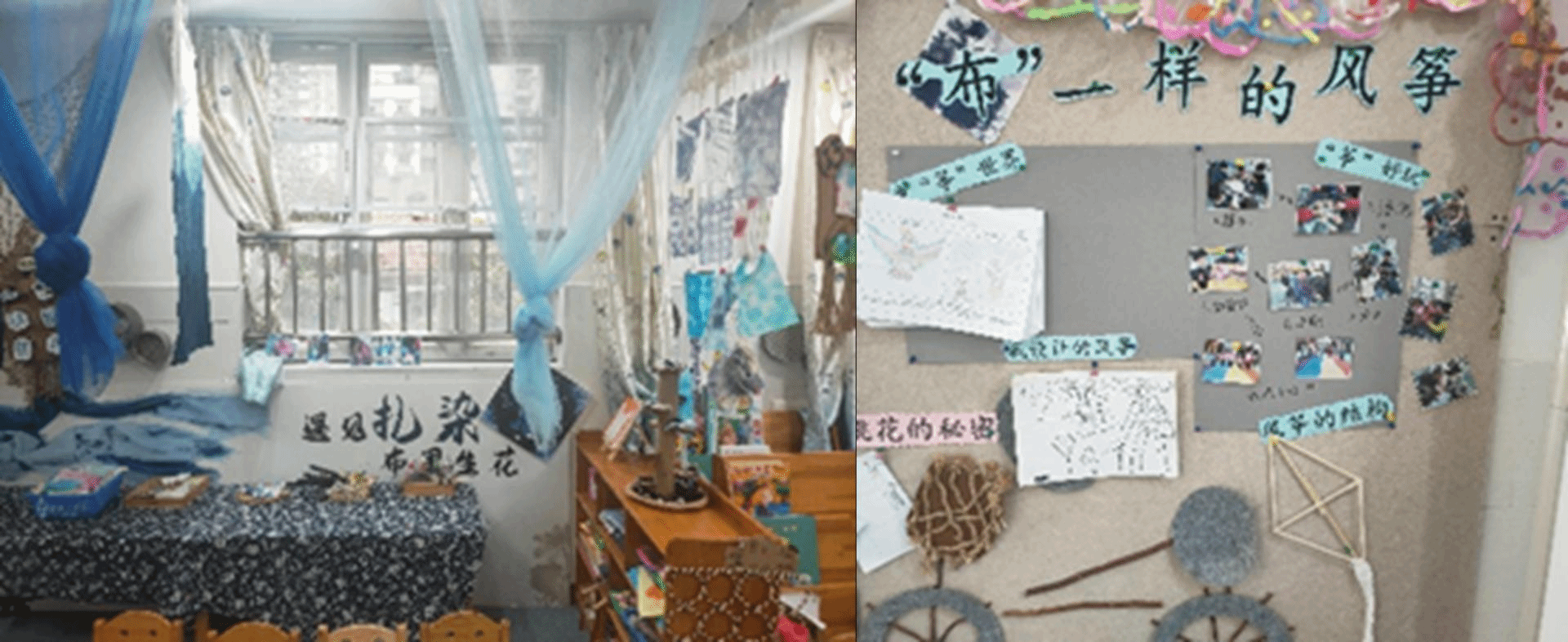 童梦幼儿园班班有传统文化特色。以我所在的中三班为例,该班级以扎染位特色,开辟了专门的“扎染区”,每个节气都会让幼儿亲自体验扎染的趣味。4月5日清明节气,教师带领幼儿分组去扎染区制作风筝,并开展“‘布’一样的风筝”主题活动。
