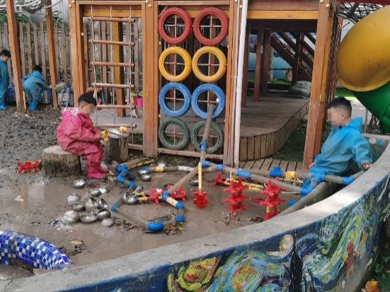 受安吉游戏的理念影响,老师很少在游戏中施加干预,因此,小朋友们可以尽情尝试。有一次,他们把水龙头拧了下来,水一下子呲了出来。小朋友们非常开心的拍着手说:“下雨啦,下雨啦!”看到这一幕的老师并没有上前制止或者把水龙头关闭,反而用手机录了下来,并且在之后的游戏分享中借此讲述了水压,重力等科学知识。