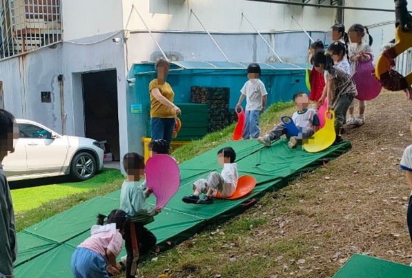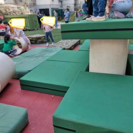 地垫在小山坡游戏区域中扮演重要角色,它既有保护作用,也有工具价值。滑索、小木屋木梯的攀爬需要在地上铺设地垫以防幼儿摔伤,滑草也需要在山坡上铺设地垫,减少摩擦。地垫的铺设和搬运工作由教师指导幼儿完成,锻炼幼儿同伴间的分工协作能力。