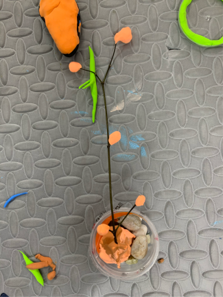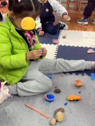 做完了一只小鱼和小猫咪,时间还有很多。于是文文从坐垫上起来去寻找一些好玩的材料。看,她找到了一根树枝,还有一些小石头。然后她开始用这些材料准备做一棵正在结果子的梨子树。刚开始这棵梨子树老是倒,立得不太稳,于是她往小盒子里面加了一些黏土,梨子树就可以立起来了(立得时间不长,未拍到立起来的照片)。