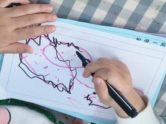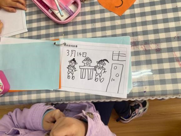 游戏故事,即儿童通过绘画的方式,对游戏的经历进行回顾、反思、叙述和表达。每次游戏结束后,儿童会自主想要表达的游戏内容,把直接经验用抽象方式表征出来,这时是第一次反思。儿童用语言向教师和家长表达自己画了什么,是如何游戏的,再用文字把他们的原词原句完整地记录下来。在跟成人表述的时候,儿童会再次思考自己在游戏中的发现与想法。在这个过程中,教师主要是引导者,主要提示幼儿画自己印象深刻的,和谁一起或者发生的有趣的事儿。
