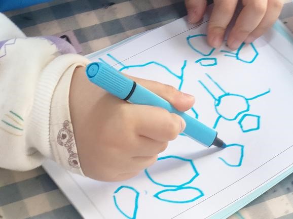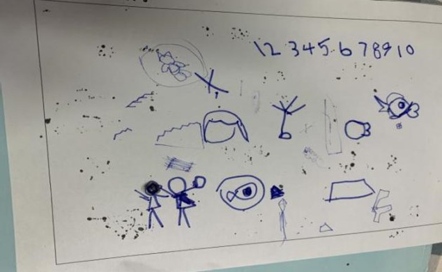 只见她娴熟地画了两个小人儿,在小儿们的中间画了一张桌子,并且在桌子上“摆上”自己想画的物品——花。画完后,她兴奋地跟我解释她的计划,用手比划自己想要画的花的颜色和大小。并且说着说着,她又在一旁补上她印象中美术室的材料柜和其他桌子。最后,一个需要亲手实现的计划跃然纸上了。