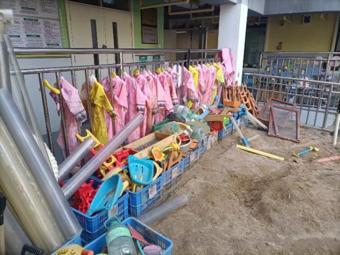 我实习的班级是小二班,我们4月份户外游戏的区域是沙水区。在此之前,我从没有见过哪个幼儿园真的让小朋友们玩沙水区的,因为很容易弄脏。那六渡桥幼儿园是怎样解决这个问题的呢?他们购置了多套全身型的雨衣,并请小朋友的爸爸妈妈买好胶鞋。这样的话,小朋友们可以随意在沙水区玩沙子和水,不必担心衣服弄脏弄湿。
