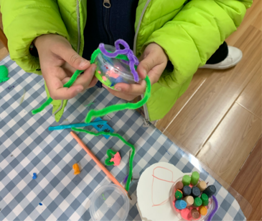 做完了梨子树,还可以干嘛呢?文文小朋友创作的灵感似乎又来了,她准备给小猫的房子做一个蝴蝶结!很可惜这个蝴蝶结不太牢固,于是她把蝴蝶结改成了一个手环,并将手环作为礼物送给了她最喜欢的吴老师!