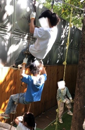 在小树林区域中,小朋友们有机会进行户外的自主游戏,充分发挥自主性与创造性,在游戏中成长。