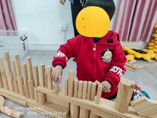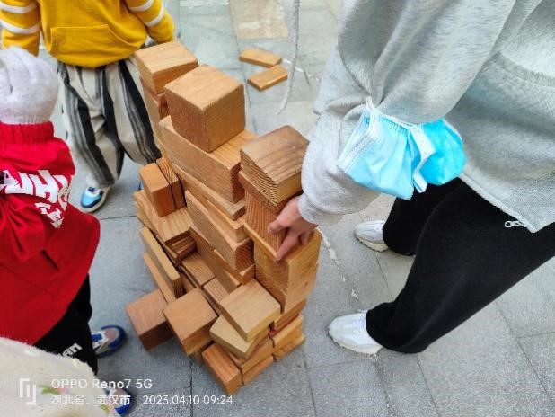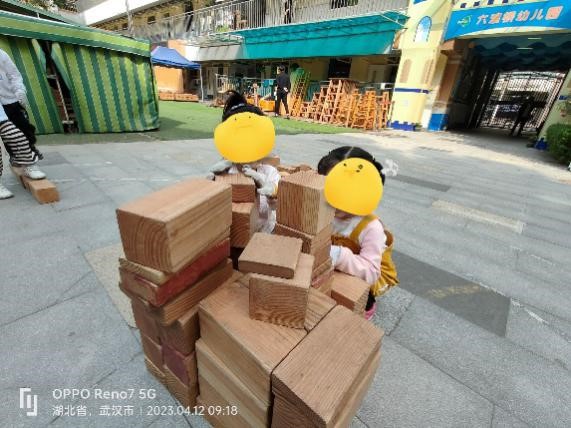 我们园以安吉游戏为特色,而我所在的小一班目前区域轮换所活动的区域是建构区,该区域有很多大型的积木,比教室里所配置的积木体积大出两三倍。