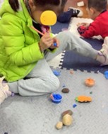 涂鸦区位于泥土区旁,有一面长长的白色画板,幼儿可以在画板上尽情施展自己的创作才能。此外,幼儿还能积极进行颜料实验,比如如何用原始的颜料调出自己想要的颜色,如何让调色碗更牢固地粘在墙上,如何创造一个“颜料瀑布”等等。