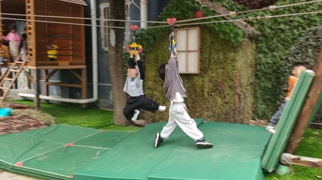 1.滑索:在初进小山坡时,幼儿园只会开展滑索一个项目。教师会详细介绍滑索具体的玩法和游戏规则,包括:双手抓紧,小脚翘起,轮流排队等。幼儿最初跃跃欲试但又小心谨慎,不过很快在他们尝试了几次之后,滑起来就相当得心应手了。对于一直不愿意尝试的幼儿,我会询问他们为什么不玩滑索,鼓励他们勇敢尝试,让幼儿亲自感受滑索下方地垫的弹性,帮助他们克服恐惧。幼儿的玩法:增加滑索的长度,探索如何让滑索滑的更快等。