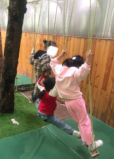 在游戏材料的操作与体验中,幼儿可以充分发挥能动性和创造性,创造新玩法,体验游戏乐趣。例如:在秋千游戏中,许多孩子从最初地坐着荡秋千的玩法,发展到站在秋千上荡,以及三人两秋千的新玩法;在绳索游戏中,一些幼儿除了最初的抓着绳索前后荡的玩法外,还尝试着将绳索绑在腰上游戏的新玩法;在软木梯游戏中,幼儿也表现出从单人游戏到多人游戏,变换游戏姿势等创新性。