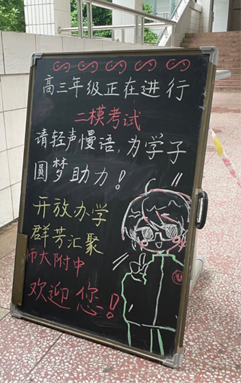 我所实习的地点为江西师大附中的青山湖校区,它也是竞赛金牌的摇篮和诸多海外名校offer的“收割机”。在踏入学校正式接手班级工作之前,我曾无数次预设了附中“严谨肃穆”的校园环境,然而现实却给了我意想不到的惊喜。
