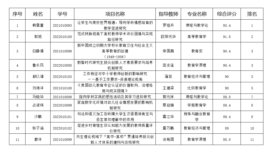 根据《华中师范大学关于2024年度优秀研究生教育创新资助项目申报工作的通知》有关精神,经个人申请、导师同意、推荐工作小组材料审核、学生现场答辩、专家组集体审核排序,按照等额推荐的原则,排名推荐如下: