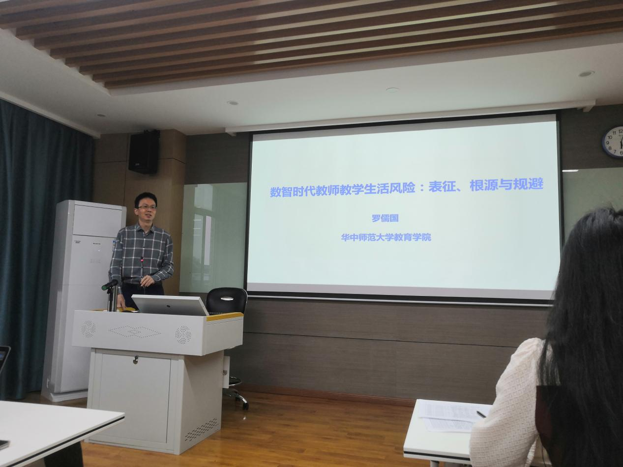教育学院融媒体中心讯(通讯员 沈盼盼 王可)2022年4月29日晚6:00,教育学院课程与教学论专业硕士研究生第十一期“学术月会”在田家炳楼905教室顺利举行。本次“学术月会”由2021级硕士研究生吴必园主持,罗儒国副教授主讲,报告主题为《数智时代教师教学生活风险:表征、根源与规避》。课程与教学论专业、小学教育专业的全体硕士研究生以及其它专业的部分硕士研究生、博士研究生等50余名同学参加了此次学术月会。