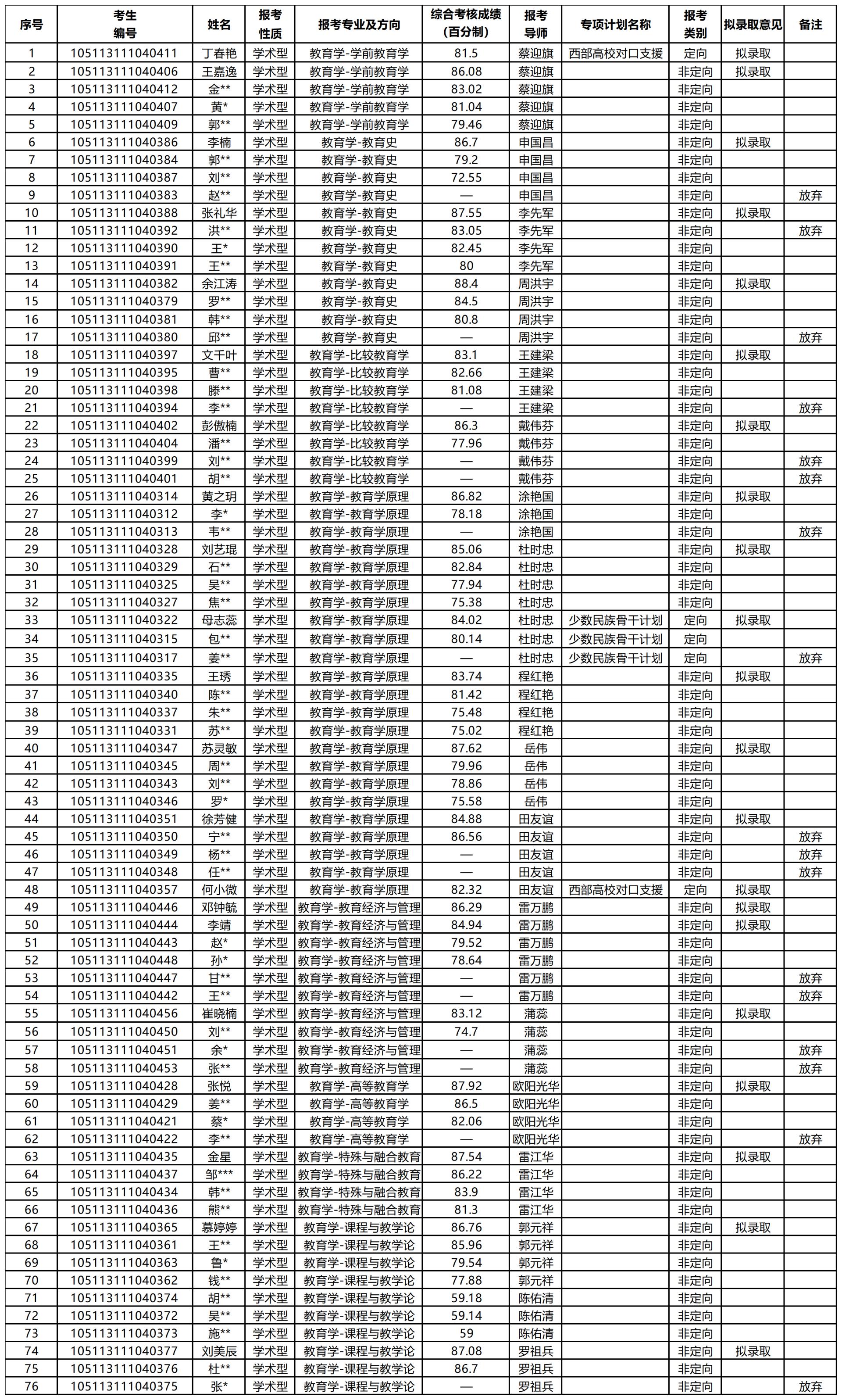 现将华中师范大学教育学院2023年博士研究生招生综合考核结果(含拟录取意见)予以公示(详见附件),最终拟录取名单,以学校公示为准。公示期为即日起的10个工作日,如有异议可以在公示期内进行申诉。申诉情况要实事求是,以便最终调查核实。
