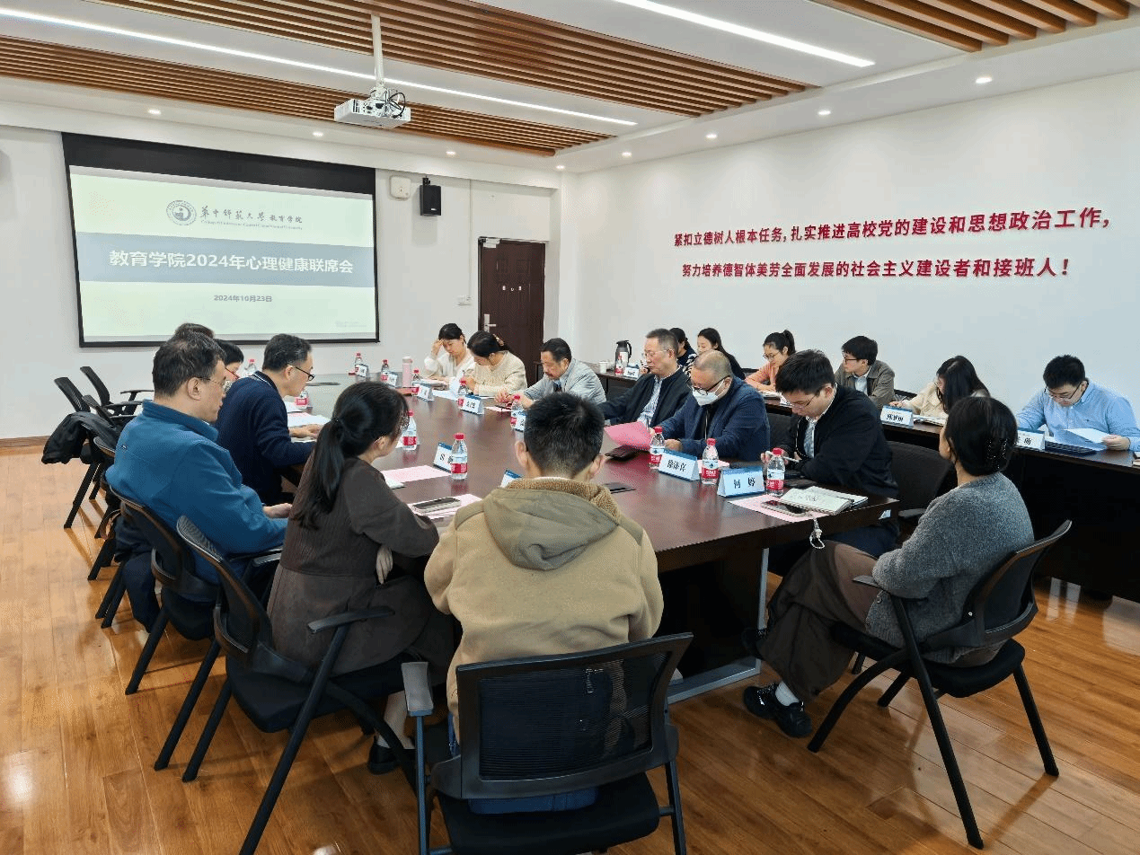 教育学院融媒体中心讯(记者 李轩 张萌)10月23日,教育学院2024年心理健康工作联席会在田家炳教育书院909教室召开。党委学生工作部副处长吴建成、校医院副院长王红、大学生心理健康教育中心主任吴才智受邀参加会议。学院党委副书记王璐,研究生导师代表余子侠、涂艳国、田鹏、戴伟芬,本科生班主任代表徐添喜、唐斌、白颖颖、韩晨、何婷,教师代表曹心怡、张鑫,以及全体专兼职辅导员出席本次会议,会议由王璐主持。
