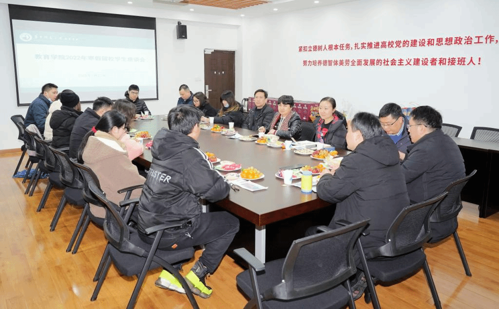 教育学院融媒体中心讯(通讯员 邵腾飞 王健)1月27日下午4点,学院在田家炳楼909会议室召开2022年寒假留校学生座谈会,全体党政班子成员、博士辅导员甘安虹及十余名留校学生参加,活动由党委副书记张扬主持。