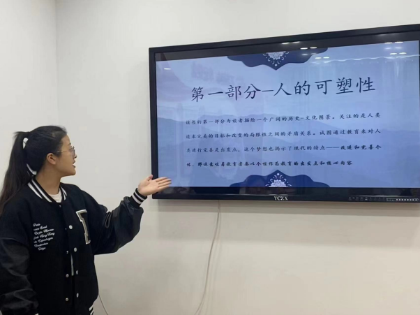 第七位分享者孙佳欣同学分享的是雅斯贝尔斯的《什么是教育》。她主要分享了雅斯贝尔斯关于教育本质、教育目的、教育内容、教育过程以及教育过程的观点,如雅斯贝尔斯认为教育不过是主体间灵肉的交流活动,包括知识内容的传授、生命内涵的领悟、意志行为的规范,并借助文化传递的功能,将文化遗产教给年轻一代,使他们自由地生成,并启迪其自由天性。她认为,当今的教育过多地关注教育对社会的贡献,对于人的精神世界的构建关注程度不够,对精神的关注应该是重于知识的传授,任何科学知识的获取都应该建立在精神导向的基础之上。