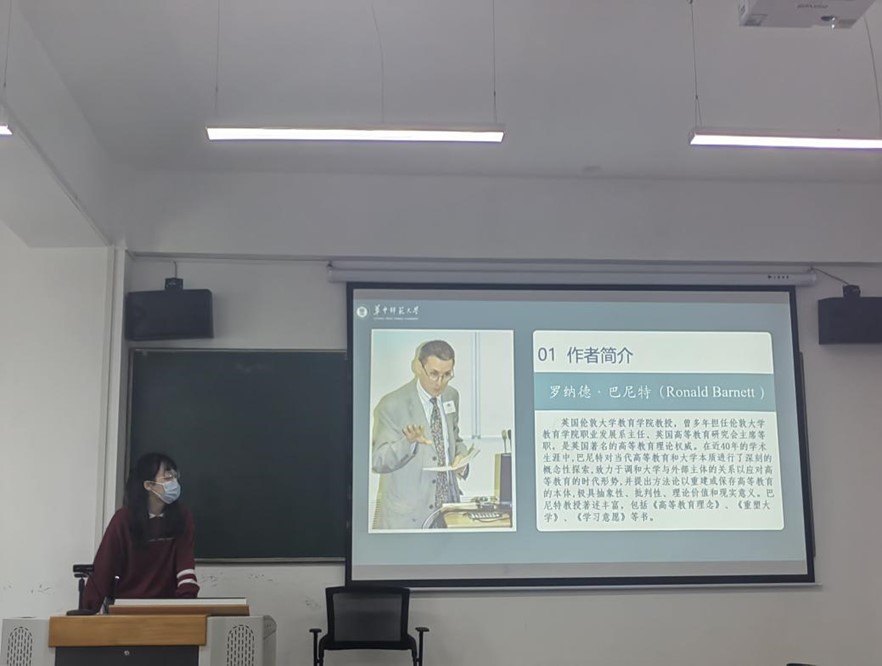 谢涵同学结合罗纳德·巴尼特的《高等教育理念》作分享,对该书结构进行梳理,全书共分为五大部分,主要内容围绕自由高等教育的本质、公理基础、关键概念及重建策略展开,对应阐释了高等教育的本体论、认识论和实践论。巴尼特先生认为,重建和实施自由高等教育理念,关键在于明晰高等教育理念蕴含着保证思想自由的解放思想。然而这种解放思想的认识论和社会学基础均受到削弱,故其从文化、理性、研究和学术自由四个关键概念入手,提出回归自由高等教育的可行性建议。只有通过学生批判性的自我反思、开放性学习、学科交叉、在课程领域融入哲学和社会学的视角,才能重建自由高等教育理念,进而实现高等教育的解放承诺。