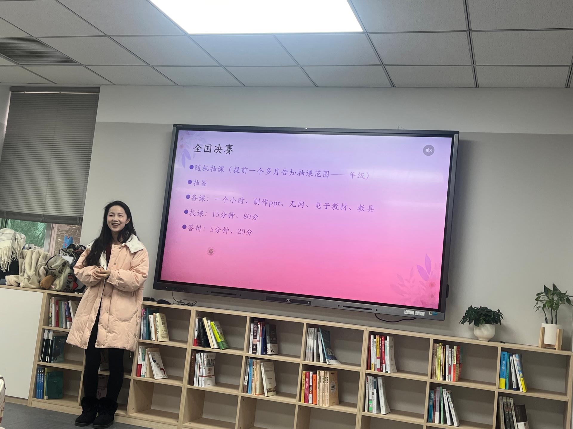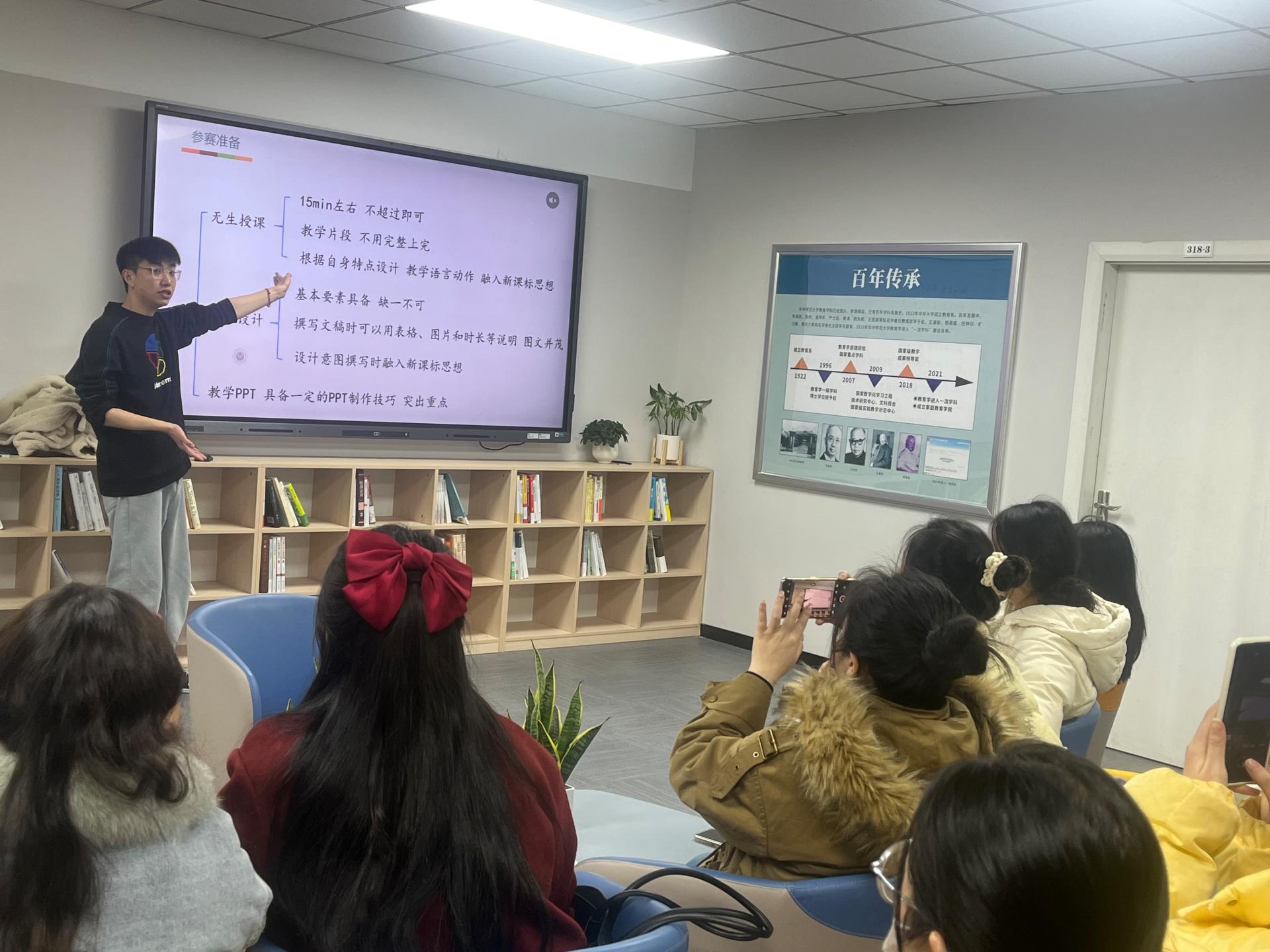 陈硕同学首先从时间规划、参赛准备和比赛感悟三个维度,结合自身经历对时间节点把控、教学设计重心、台风培养等方面提出独到见解。李芳芳同学则着重提出:三字一话是教学技能的基础,教姿教态是授课效果的点睛,学习名师的教学经验是技能拔高的捷径。
