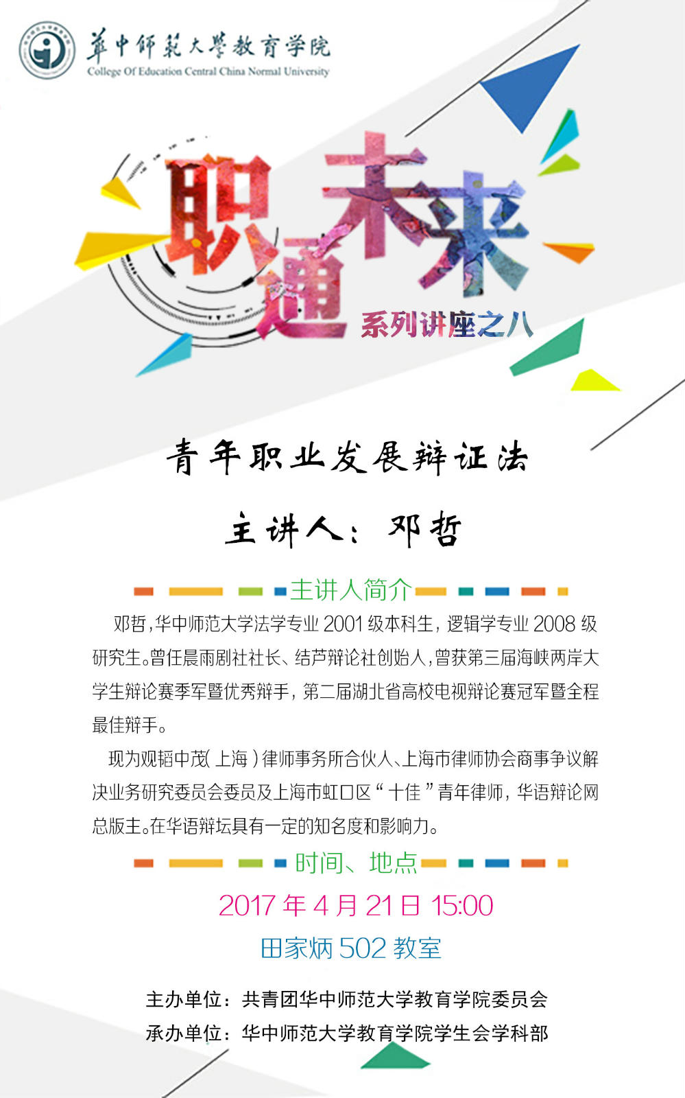 为贯彻落实教育部关于做好大学生的就业指导和服务工作的相关精神,提高我院学生的生涯规划意识和生涯管理能力,引导我院学生从优秀校友故事中启迪思想、激励人生,邀请邓哲律师为我院师生作分享交流。具体信息如下:
