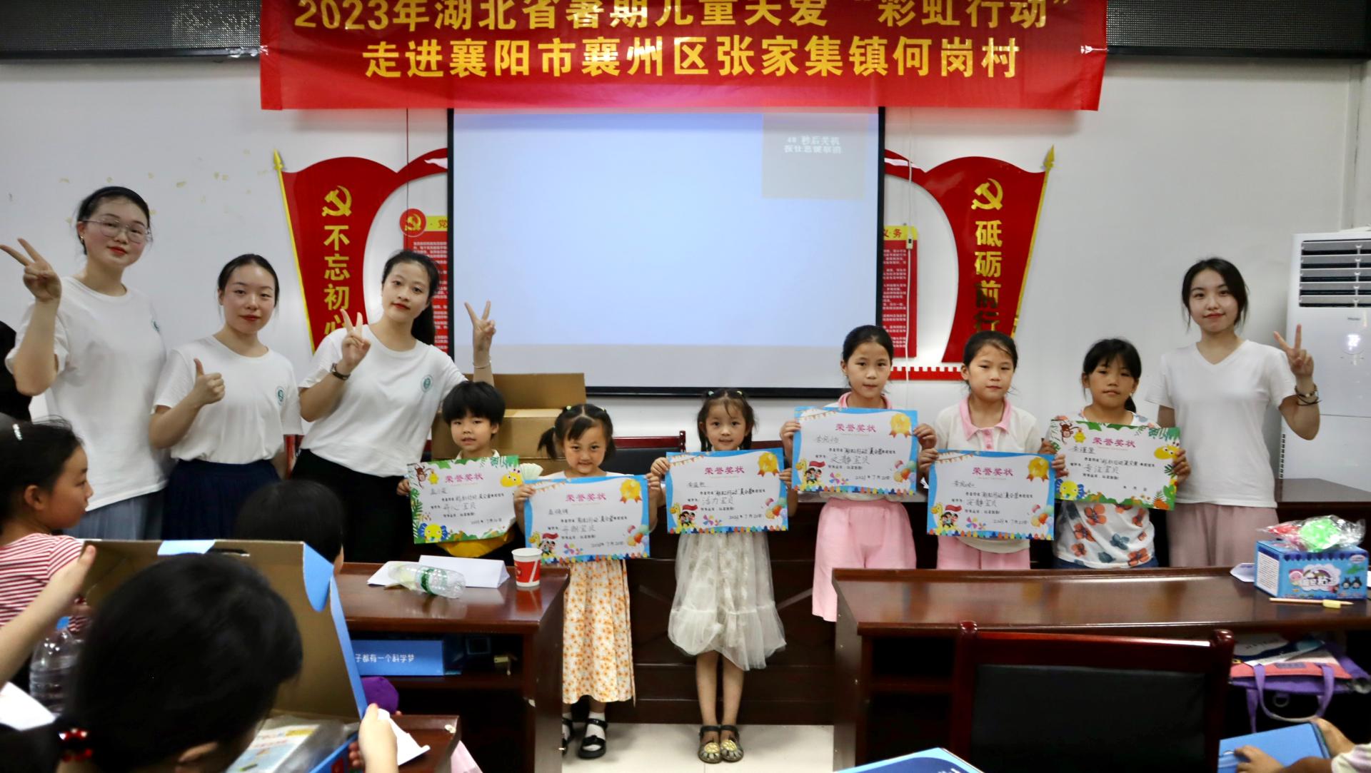 孩子们拿着奖状、奖品与志愿者们在何岗村村委会旁合影留念,在欢乐中结束了2023年度襄阳“彩虹行动”结课仪式,为这次2023年“彩虹行动”暑期社会实践画上了圆满的句号。