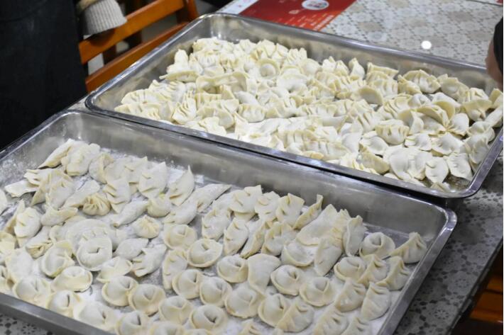 喜气洋洋包饺子,巧手聚福气。随着食堂工作人员端上一盆盆充足的馅料和饺子皮,“大厨们”纷纷挽起袖子,投入包饺子大军之中。有人手法娴熟,快速地捏出一个个漂亮的饺子;有人是初次尝试,小心翼翼却也有模有样;有的则创意大发,包出一个个形状各异的饺子。在欢声笑语中,一盘盘小巧精致、饱满诱人的饺子逐渐摆满了桌面,等待下锅。