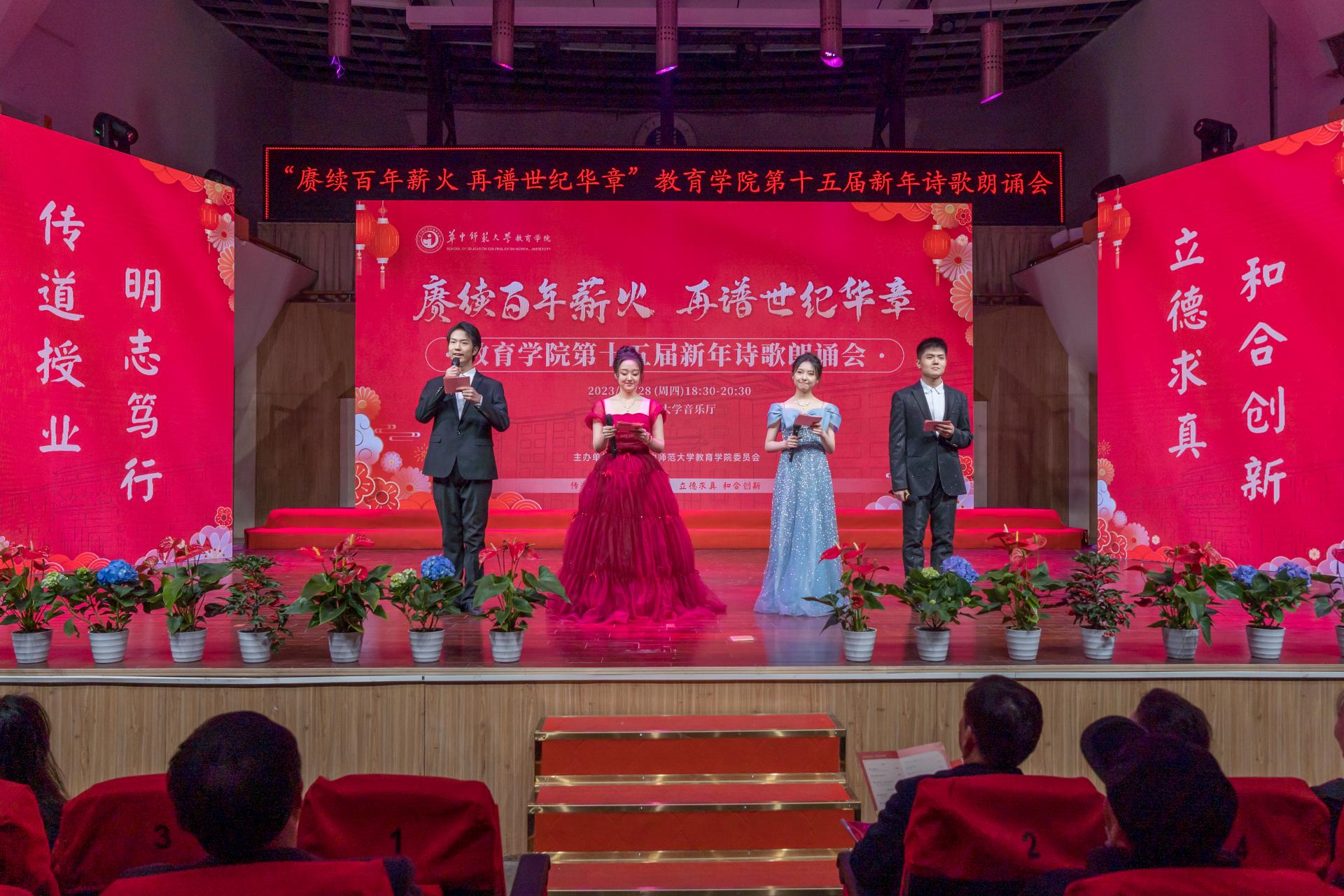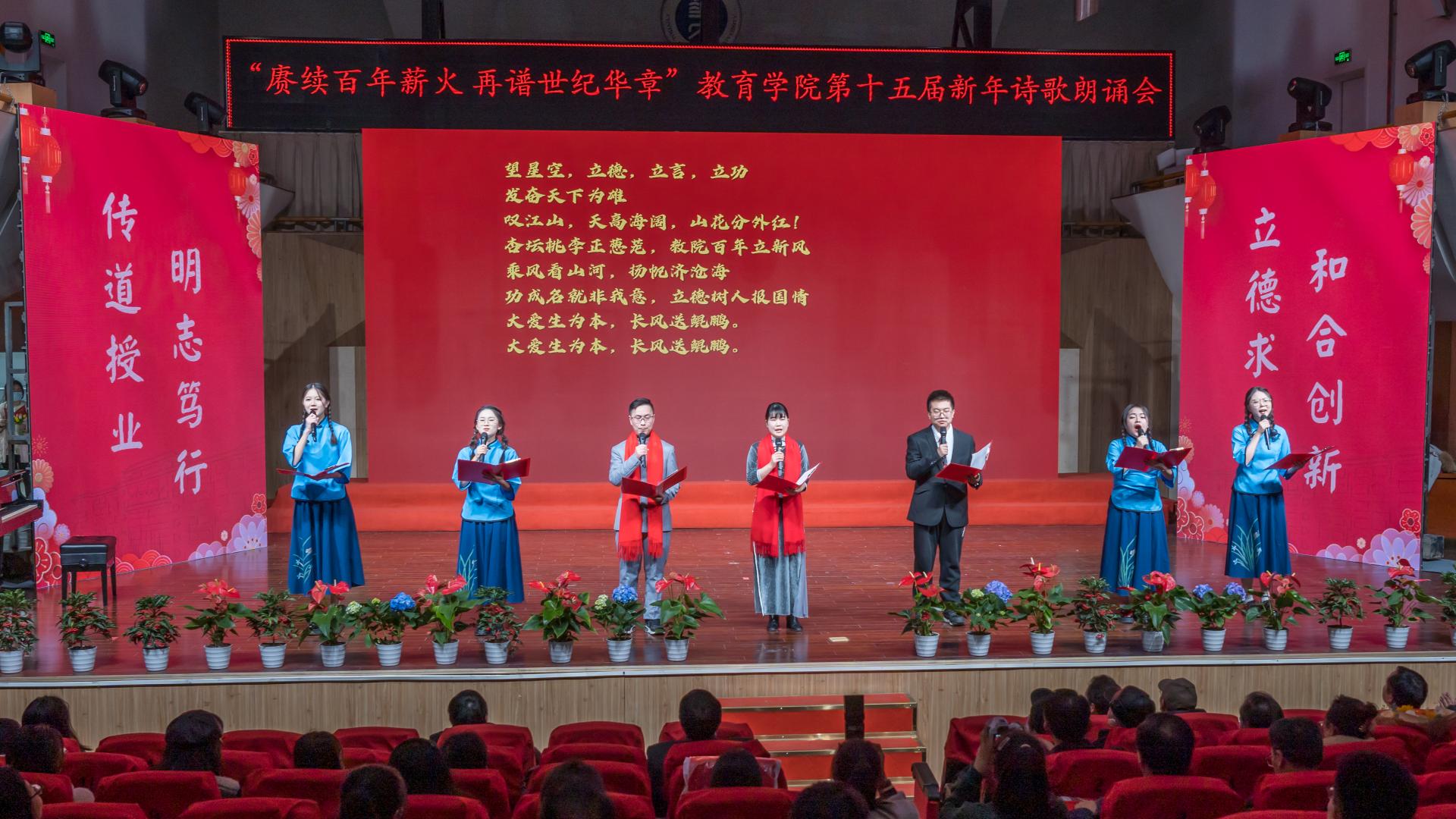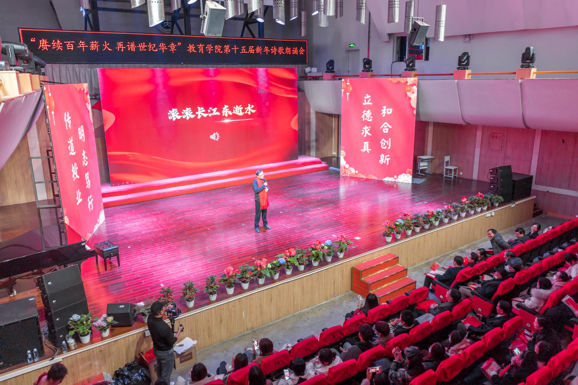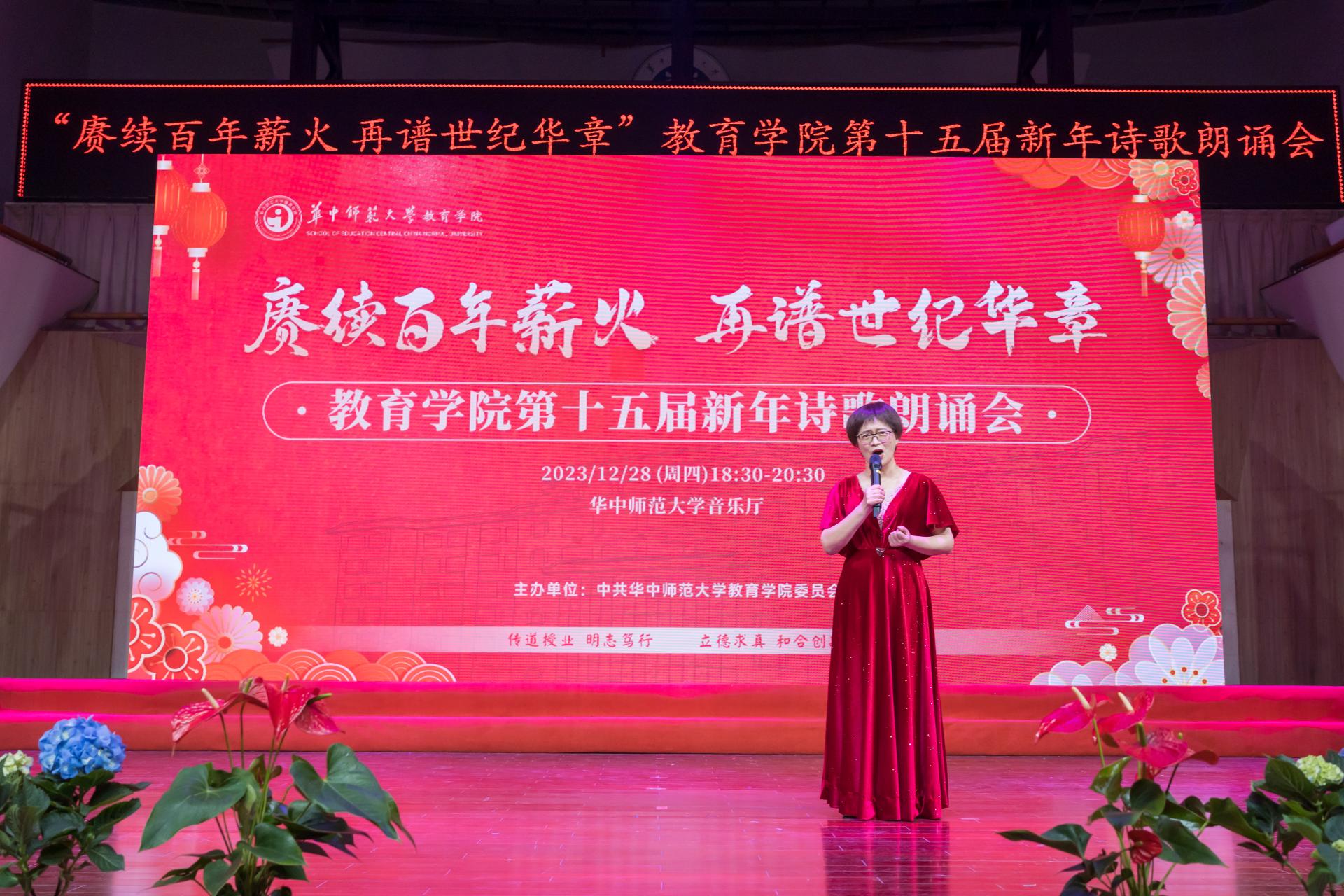 教育学院融媒体中心讯(通讯员 刘馨雨等)12月28日晚,教育学院第十五届“赓续百年薪火,再谱世纪华章”新年诗歌朗诵会在华中师范大学音乐厅隆重举行。学院党政班子、党委委员、各系所教师代表、离退休教师代表、院友代表及本研学生近400人参与活动。