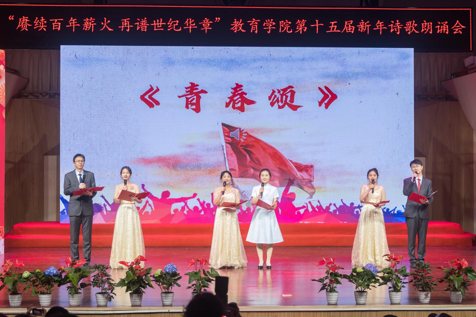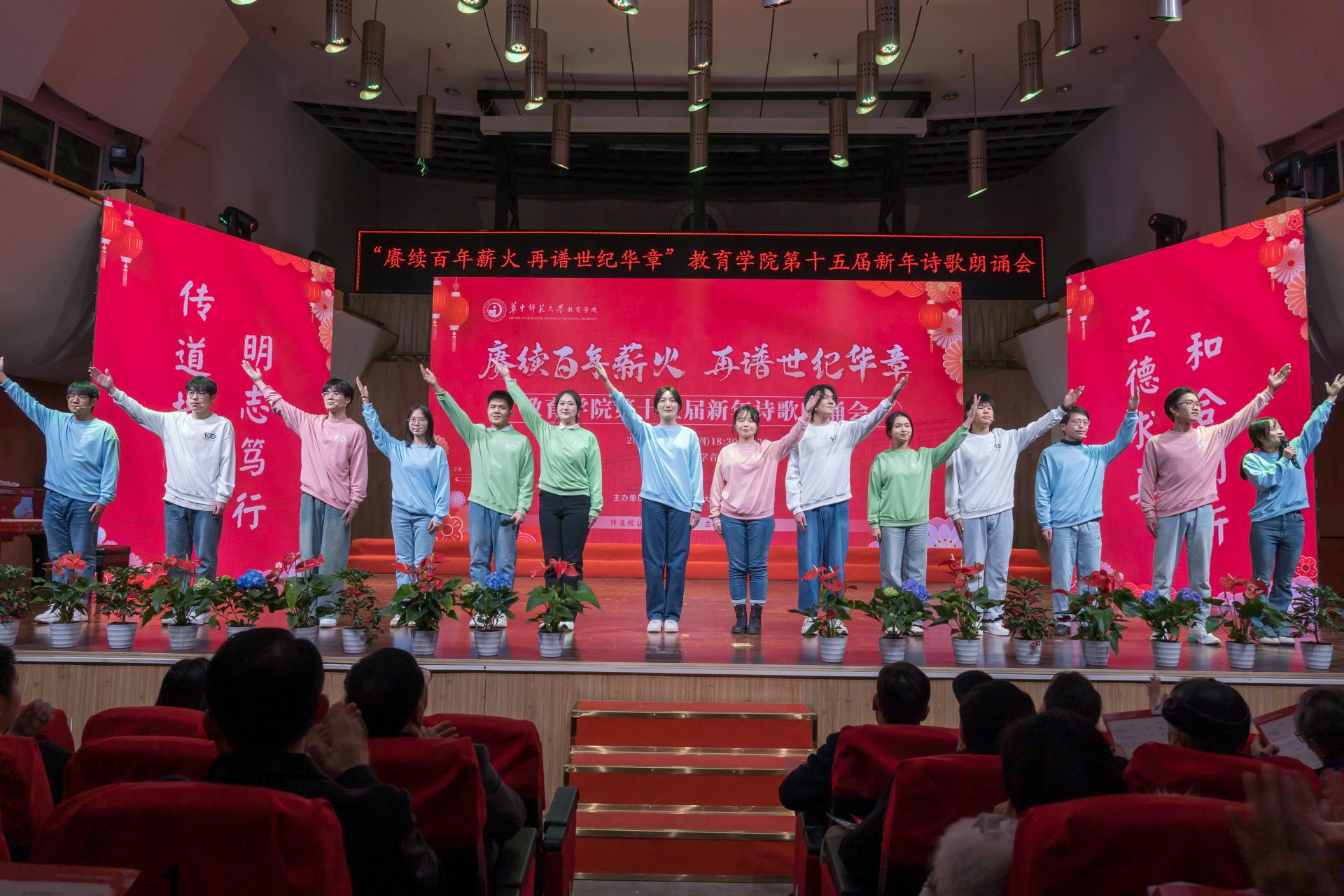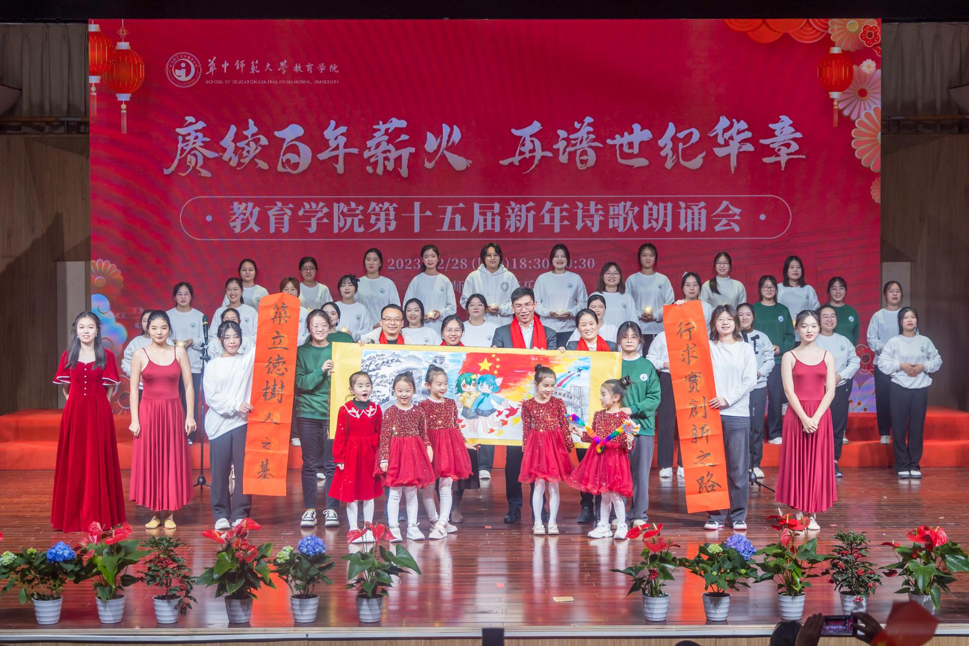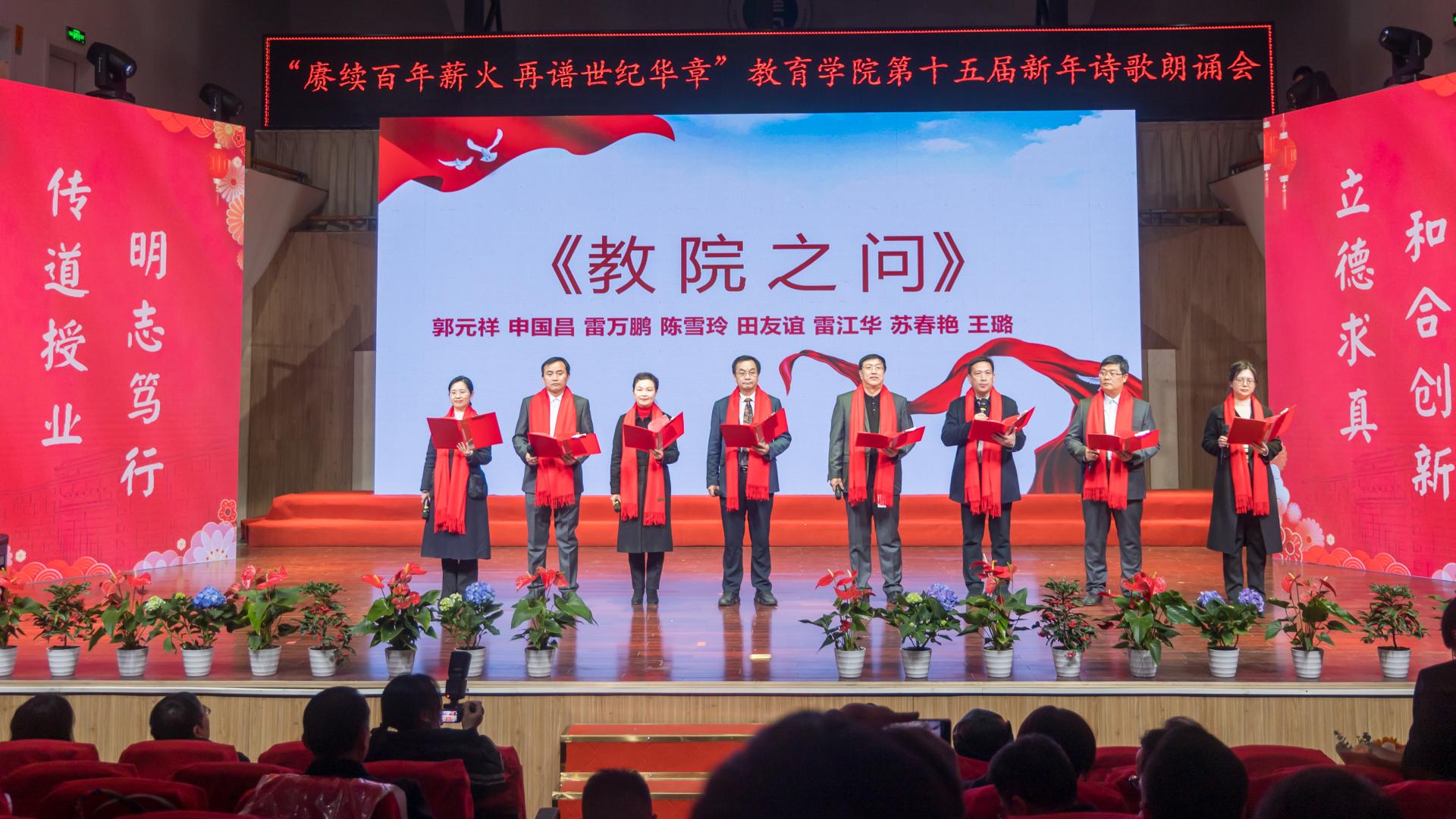 教育学院融媒体中心讯(通讯员 刘馨雨等)12月28日晚,教育学院第十五届“赓续百年薪火,再谱世纪华章”新年诗歌朗诵会在华中师范大学音乐厅隆重举行。学院党政班子、党委委员、各系所教师代表、离退休教师代表、院友代表及本研学生近400人参与活动。