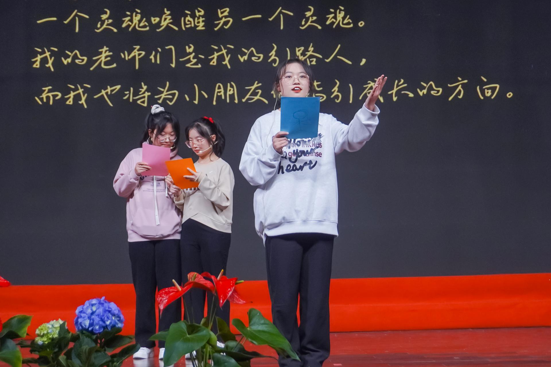 图为研究生支教团志愿者代表、本科生代表共同表演诗朗诵《教院故事》