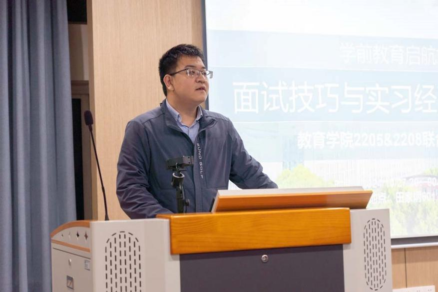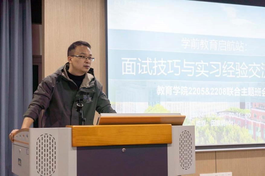 教育学院融媒体中心讯(通讯员 陈思羽 舒歆 郑炜君)为帮助同学们更好地了解学前教育行业的就业形势,掌握就业技能,提升职业素养,2205班与2208班携手合作,在教育学院田家炳楼601报告厅开展了以“学前教育职业启航站:面试技巧与实习经验分享”为主题的班会活动。武汉市江汉区盛世红苗幼儿园陈霄逸副园长、2205班班主任吴航老师、2208班班主任尹国强老师、教育学院研究生辅导员张萌老师、教育学院2022级本科生兼职辅导员王利娜老师和2205、2208班学前教育专业同学参会,2208班团支书黄钰祯、学习委员陈柯帆主持活动。