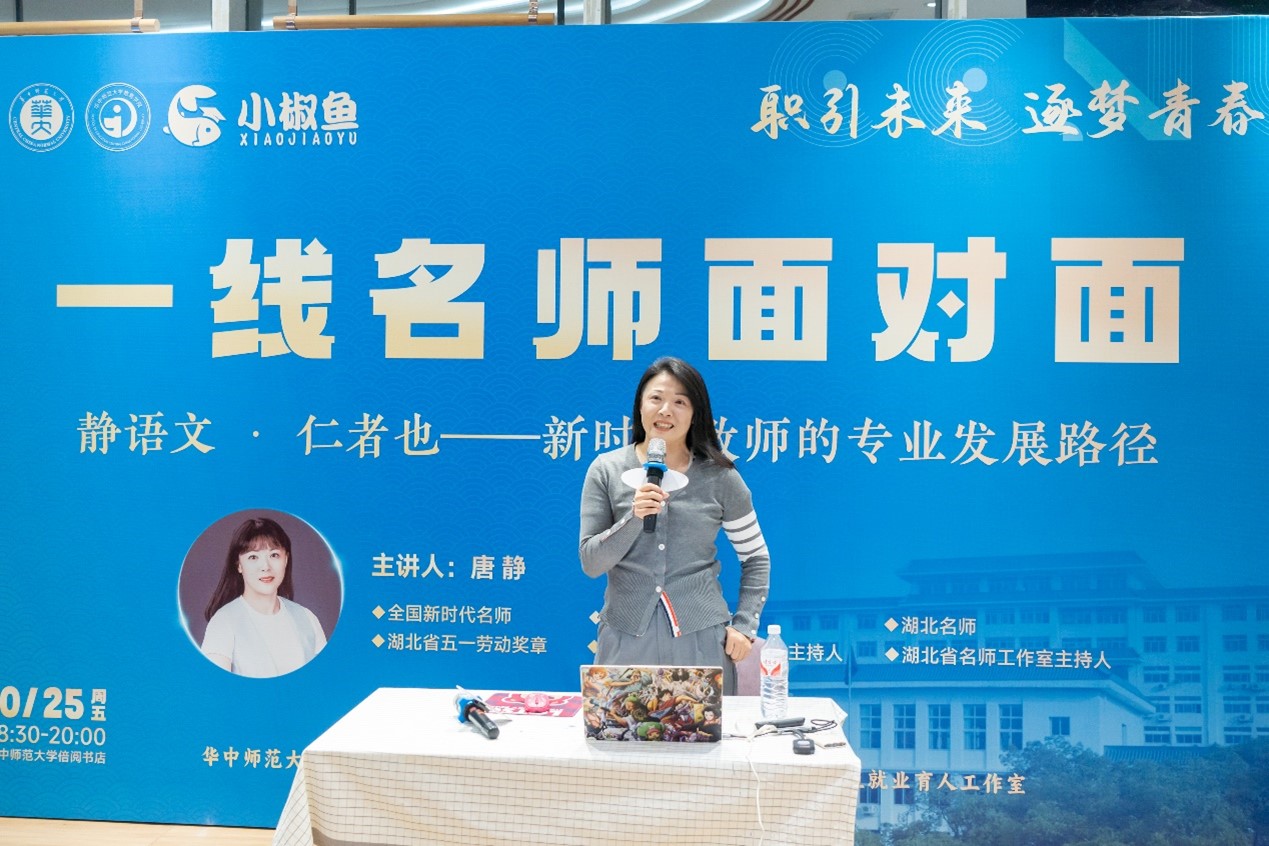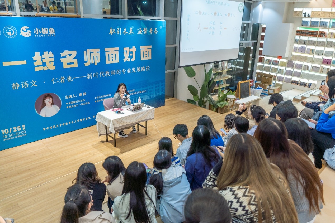 教育学院融媒体中心讯(通讯员 孙宁)10月25日,由学校党委学生工作部就业处主办,教育学院承办的“一线名师面对面”第三期主题活动在倍阅书店举行。全国新时代名师、湖北省特级教师、华中师范大学2024级教育学院博士研究生唐静以“静语文 · 仁者也——新时代教师的专业发展路径”为主题作报告,并与在场学生进行了深入交流。党委学生工作部就业处卢雯、教育学院党委副书记王璐、各年级辅导员代表,以及九十余名本研学生参加。活动由2021级本科生辅导员彭雨茜主持。