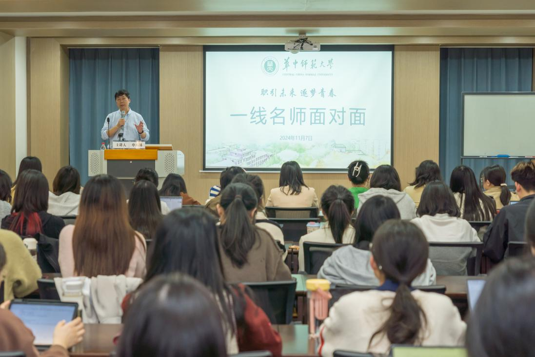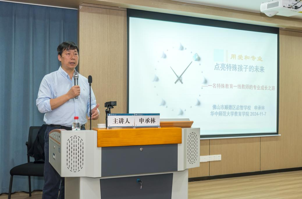 教育学院融媒体中心讯(通讯员:赵筱桐 张淇乔)2024年11月7日,由华中师范大学党委学生工作部就业处主办、教育学院承办的“一线名师面对面”第四期主题活动在田家炳楼601教室举行。全国模范教师,全国最美教师,佛山市顺德区启智学校党支部书记、校长申承林以“特殊教育教师的职业化和专业化——兼谈培智教育校本课程开发与实施”为主题作报告。华中师范大学教育学院党委副书记王璐、融合教育教研室主任彭兴蓬、各年级辅导员代表以及六十余名本研学生参加。本次活动由特殊教育系主任孙玉梅主持。