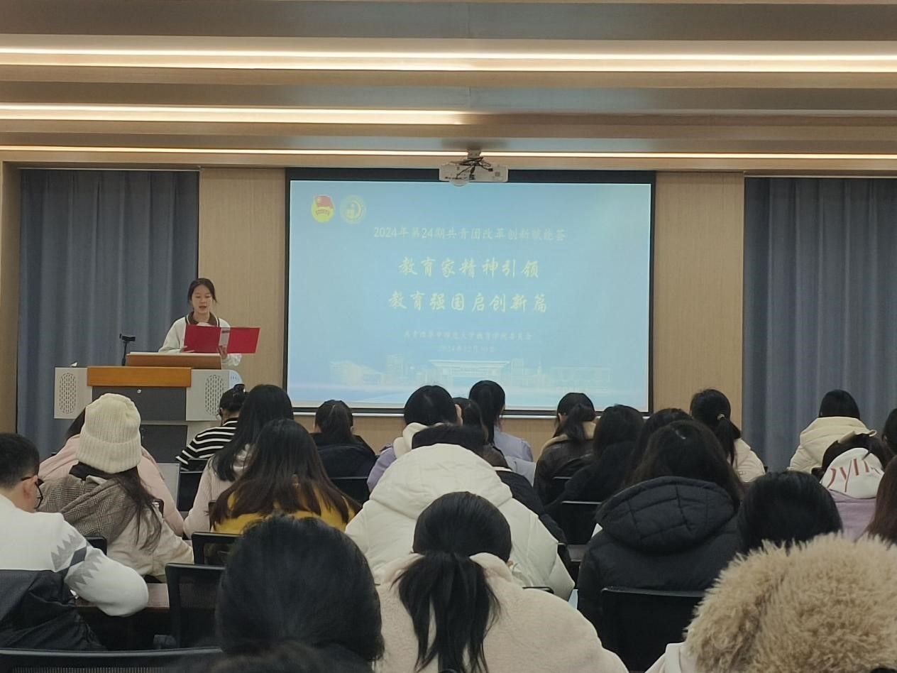 教育学院融媒体中心讯(通讯员 孙宁 魏银莉 杨宇)为进一步发挥共青团在高校学生思想政治工作中的主力军作用,创新实践育人体系,全面服务成长成才,发挥好各级团干部的榜样带头作用、桥梁纽带作用,12月30日上午,2024年第24期共青团改革创新赋能荟在田家炳教育书院601室举行。教育学院团委书记史磊出席,团委学生会全体成员、各年级团总支、各支部委员会参与。本次会议由学院团委组织部潘怡宁主持。