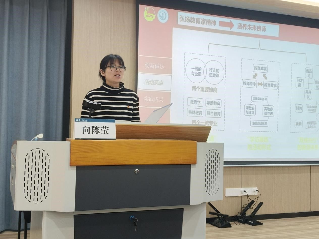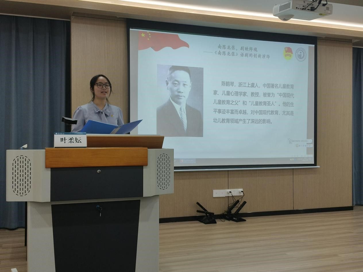 教育学院学生会主席团成员叶柔妘以“南陈北张,剧映师魂——南陈北张话剧的创新演绎”为主题作分享交流。她指出,南陈北张的教育家精神,是我们新时代教育工作者的宝贵财富。在新时代背景下,我们更应该将教育家精神融入教育事业的发展中,为国家的繁荣富强和民族的伟大复兴贡献自己的力量。她呼吁同学们携手共进,共同弘扬南陈北张的教育家精神,为新时代教育事业的发展贡献自己的力量,以实际行动践行教育家的誓言,为国家的繁荣富强和民族的伟大复兴而努力奋斗。