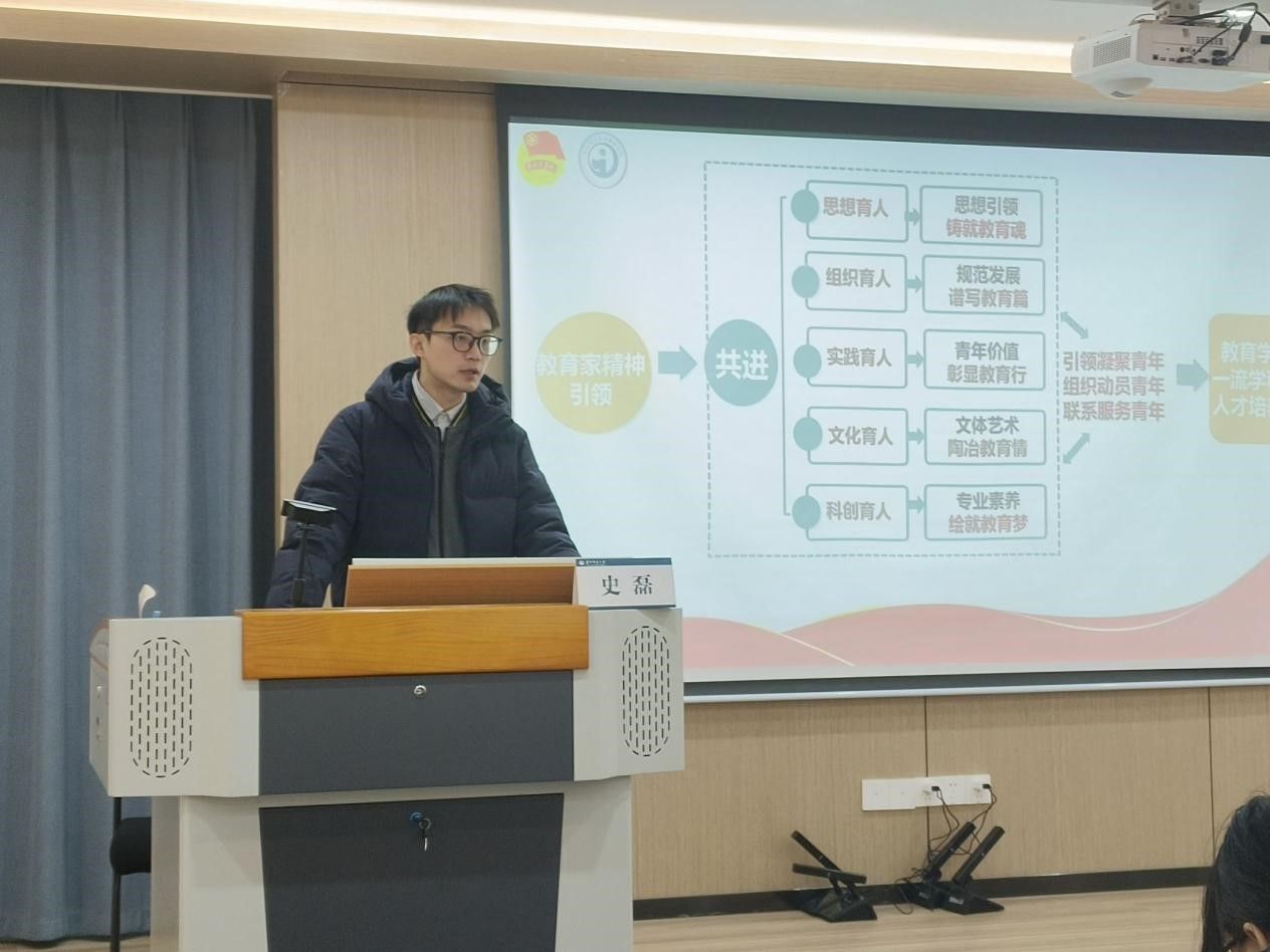 团委书记史磊以“统筹三对关系 以教育家精神引领教育学一流学科人才培养”为题,结合学院品牌特色和资源优势,介绍了学院团学工作助力教育学一流学科人才培养的路径探索,在社会实践方面,打造了原创话剧、系列大师课等特色化品牌项目,收获广泛好评,同时,教育学院在文化活动与体育活动上捷报频传,在助力学生科创及专业素养提升方面取得佳绩。他表示,教育学院团委将始终坚持守正创新,不断打响学院品牌特色,探索出更多新形式、新做法,积极引导广大青年学子以奋斗姿态激扬青春,在火热实践中绽放梦想。