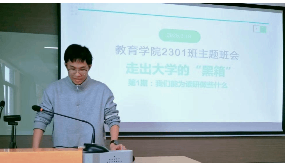 本次活动分为两个阶段,前半程为2301班主题班会,后半程为主题团课活动。在主题班会阶段,班主任孙冉围绕升学核心环节展开系统指导,从“读研目标与准备”、“简历优化与描述”、“面试介绍与环节”三大模块展开,解析教育学专业读研路径与方法。吴桐以“保研暗河漂流记”为主题,分享其保研规划与历程,从“保研阶段”与“保研目标”上为同学们勾勒出清晰的进阶路线。