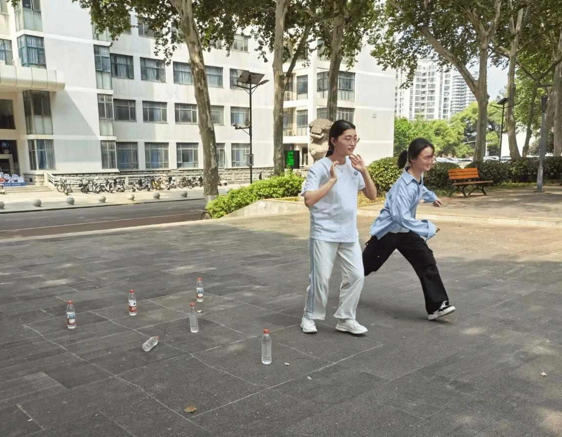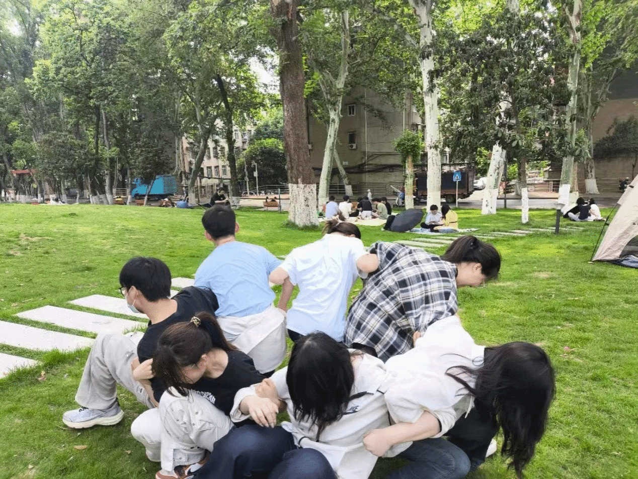 首站校史馆草坪,“坐地起身接力”从两人背靠背手不撑地起身开始,逐渐增加人数,直至全员共同完成。随着人数增加,重心协调难度倍增,队员们或重心不稳摔倒在地,或互相拉扯勉强起身,失败时的笑声与成功时的欢呼声此起彼伏,真正诠释了“不抛弃、不放弃”的团队精神。