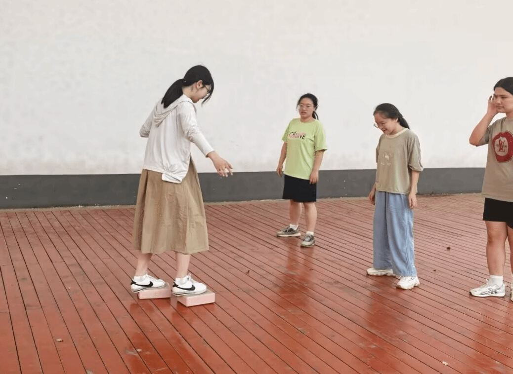 露天电影场的趣味游戏也同样掀起热潮。“摸石过河”项目中,各队队员迅速找到了抵达对岸的最佳方案,队员脚踩两块泡沫砖,手上拿着一块泡沫砖,如“水上行舟”搬交替前移。紧接着的“影子连体战”更添趣味,每队拆分为3组进行两人三足竞速,志愿者口令一经下达,奔跑声、欢笑声与呼喊声交织,现场气氛热烈。除了5个主线关卡外,校园各处还散落着隐藏打卡的惊喜环节,为校园角落的探索之旅增添趣味。