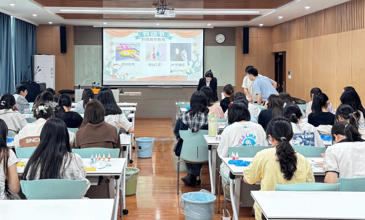 在折纸手工环节,现场提供“劳动勋章”、“劳动工具”和“感恩花束”等制作教程,同学们依据个人喜好,挑选彩色卡纸,专心致志地创作属于自己的作品。一张张彩纸在他们的手上逐渐成型,每一道折痕都是心意,每一份作品都充满创意,展示着同学们指尖上的劳动魅力。