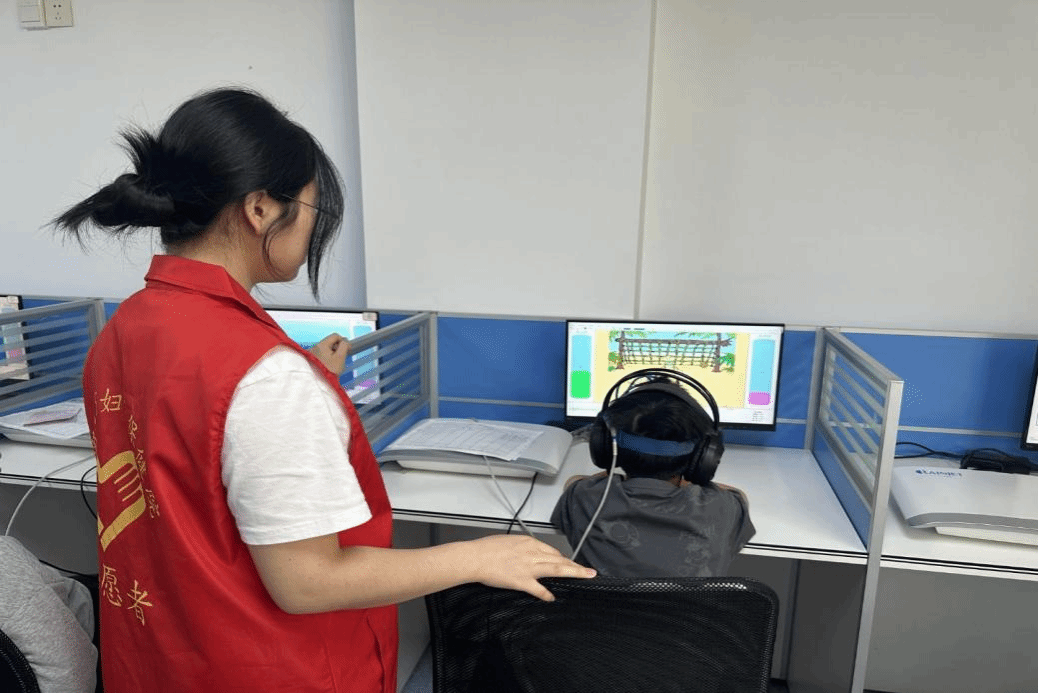 下午,志愿者们陪同孩子们进行设备诊疗和康复游戏互动。在医生和治疗师的安排下,志愿者们耐心引导孩子们使用感统训练设备、语言治疗仪器等专业康复设施,并通过电脑互动游戏增强他们的认知能力和表达能力。整个过程中,志愿者们以专业、细致的态度,为孩子们营造了轻松愉快的康复环境。