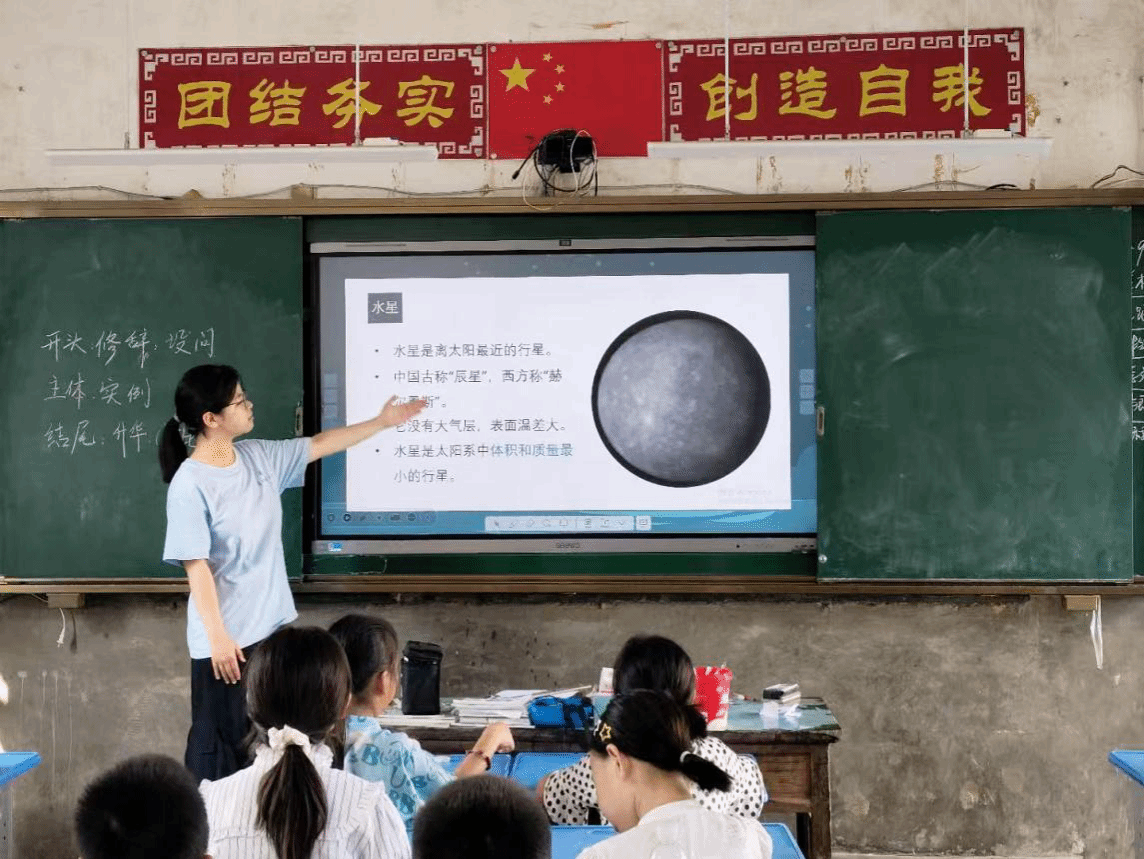 队员范与菲以屈原的《天问》开篇,带领同学们追溯古人对星空的探索历史。为直观呈现行星的大小与距日远近,同学们在老师的带领下动手制作纸质模型。接着,范与菲讲解每颗行星的独特之处,并配上口诀帮助识记。这堂天际科普课不仅让同学们认识了太阳系,更点燃了他们探索宇宙的热情。