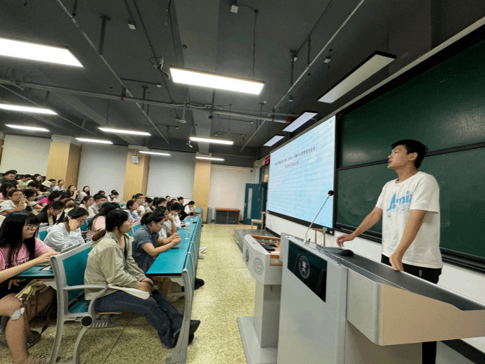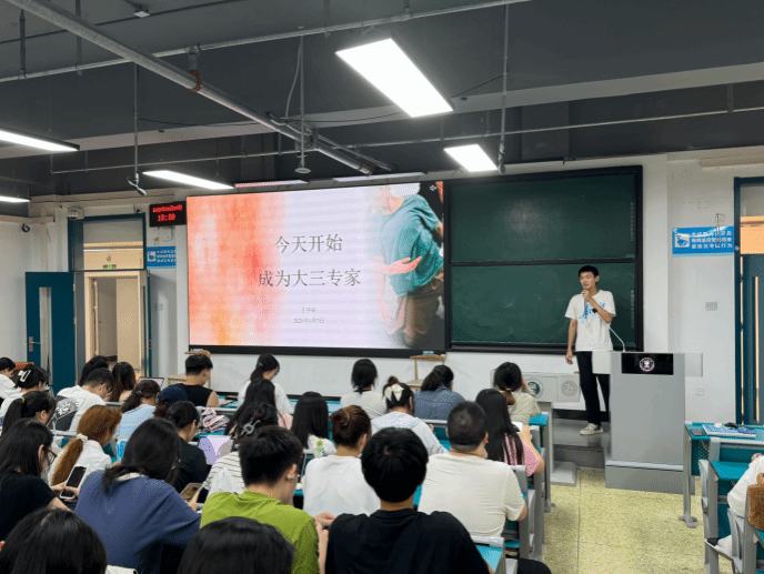 教育学院融媒体中心讯(通讯员 魏银莉) 9月7日,教育学院2023级本科生“师吾长技”分享会在八号楼8310教室举行。本次分享会由2022级教育学专业本科生王宇轩担任主讲人,他以“今天开始成为大三专家”为主题,结合自身经历,围绕跨专业考研、兴趣发展与学业规划等话题,与同学们分享如何在平凡中寻找突破、在探索中实现自我成长的实用经验与心路历程。