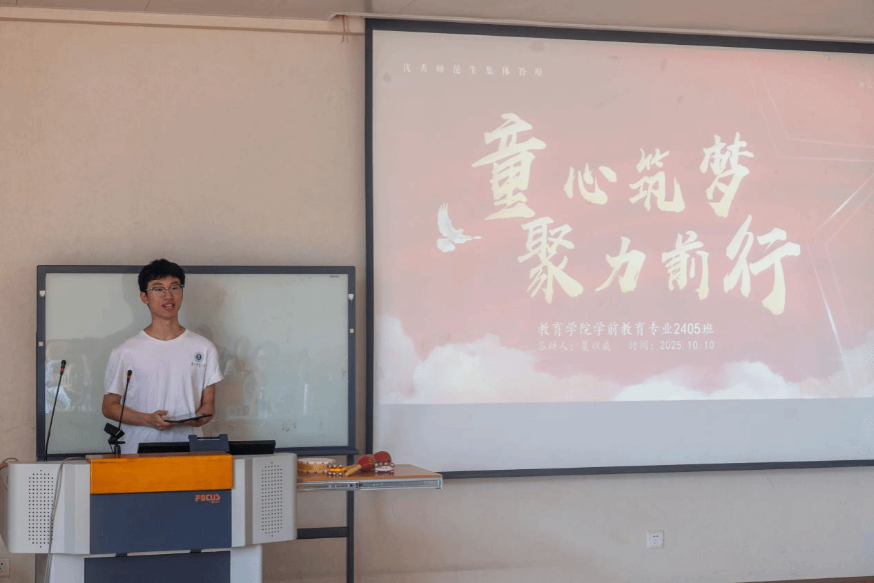 2405班班长夏以威以“童心筑梦,聚力前行”为主题,系统介绍了班级在思想引领、学风建设和实践创新等方面的成果,并现场演绎了情景剧《逐光而行·幼教梦华》。该剧围绕“蹲下来看世界”的学前教育理念,融入舞蹈元素,生动呈现了学子从初识理想至成长为幼教教师的完整历程。