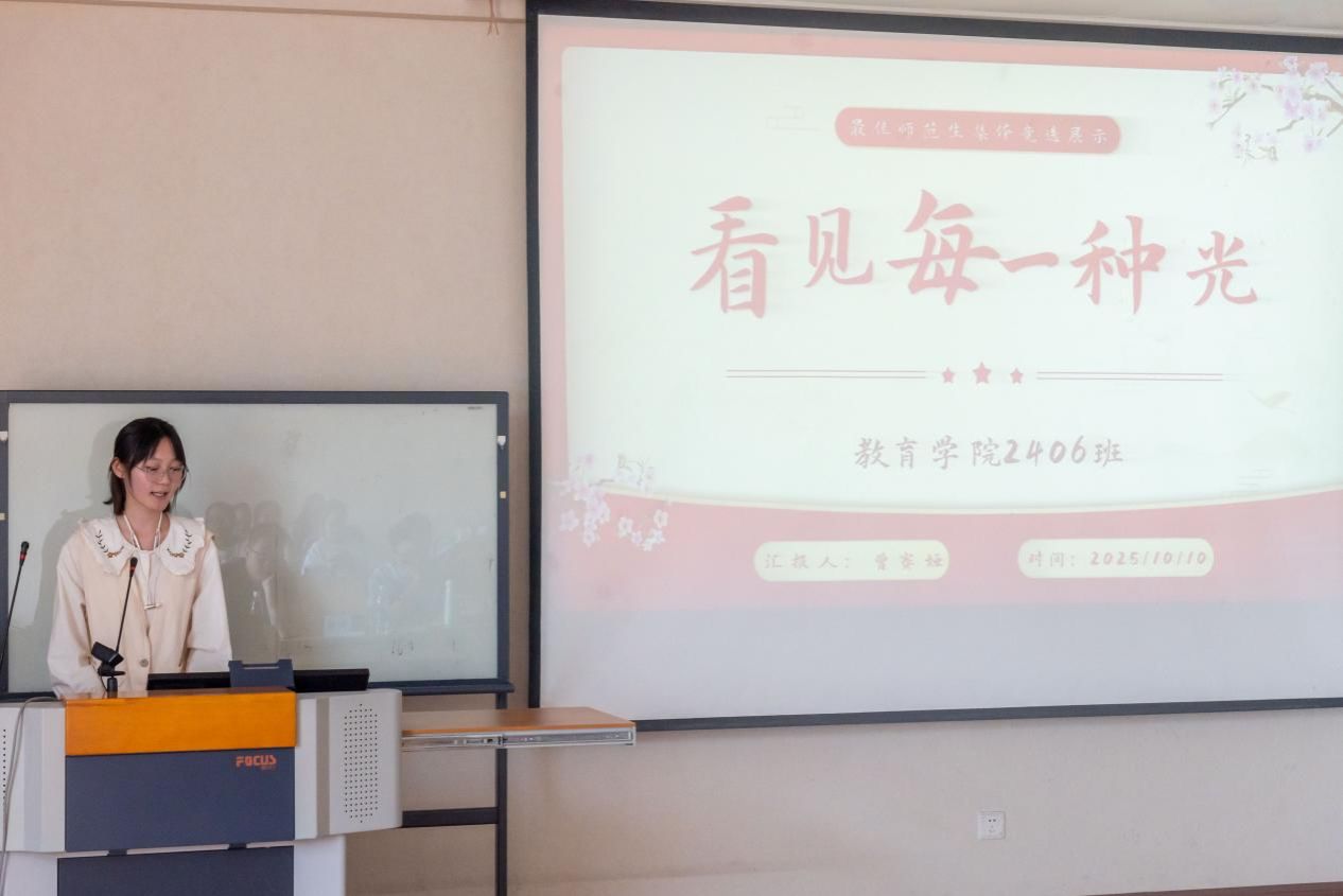 教育学院融媒体中心讯(通讯员 王叙心 姚俊伊 勾良爽 周佳瑶)为增强师范生集体凝聚力,以展示促进交流,以评比促进成长,10月10日中午,教育学院“最佳师范生集体”评选暨风采展示活动在田家炳教育书院502室举行。特殊教育系讲师王崇高、学前教育系讲师何婷及2024级本科生辅导员史磊担任评委,24级师范班级参与评选,活动由团委学生会学科部成员张羽佳主持。