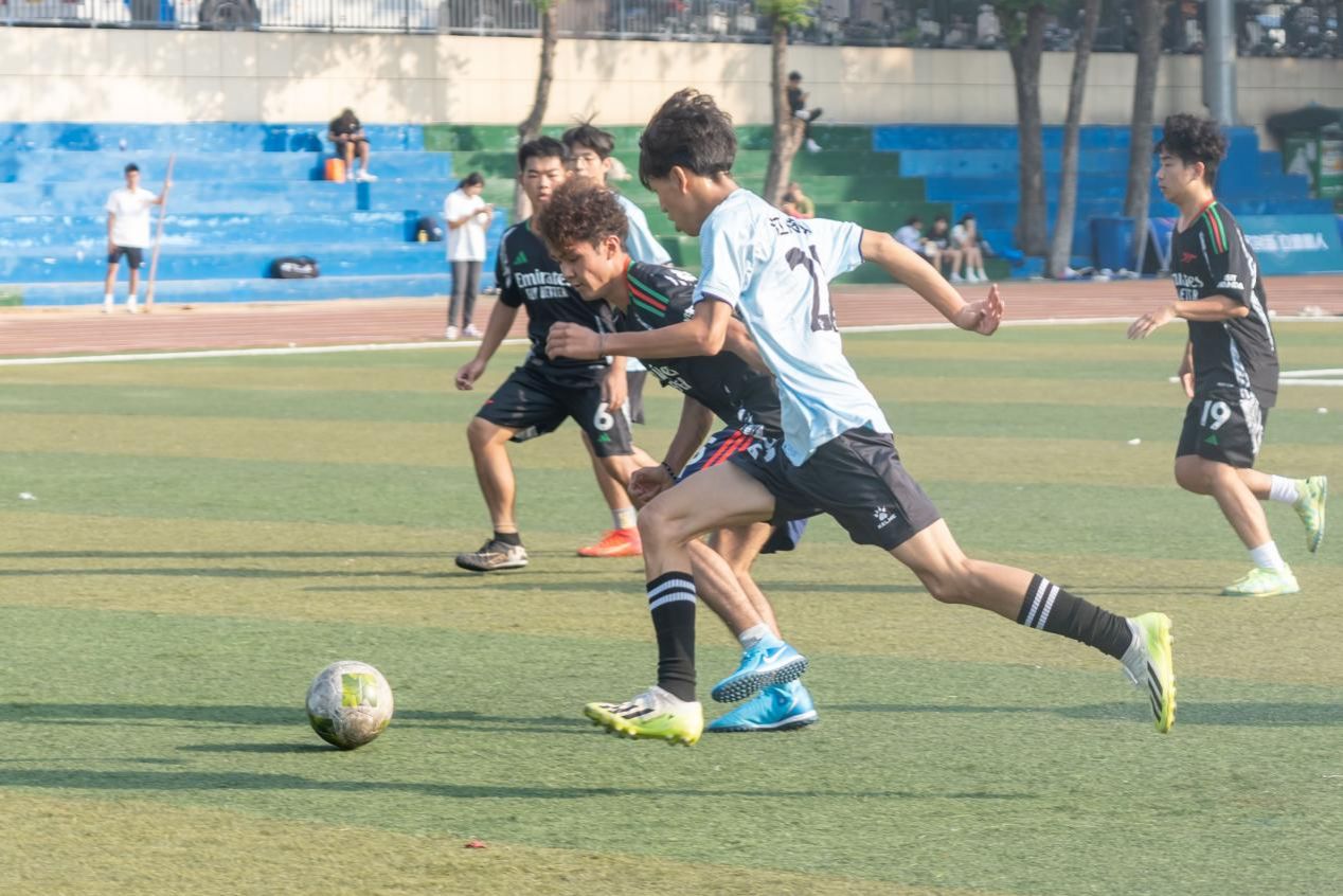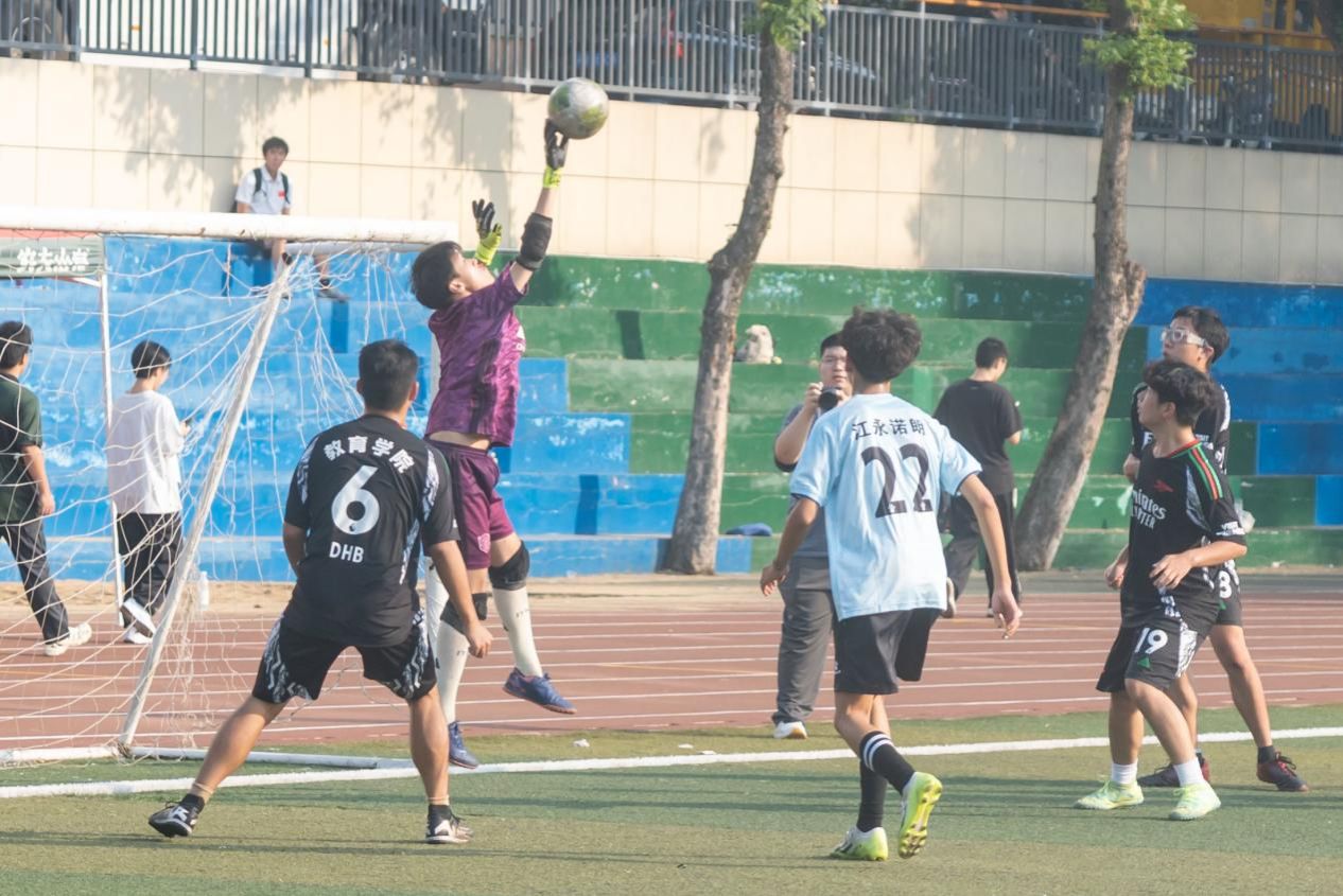 比赛上半场,经管学院攻势凶猛,多次将球压制在我方半场。在一次门前混战中,对方球员险些破门,教院后卫果断解围,力保球门不失。随后,伊耶那提精准长传迅速将战火引向对方半场,教院展开积极反扑。