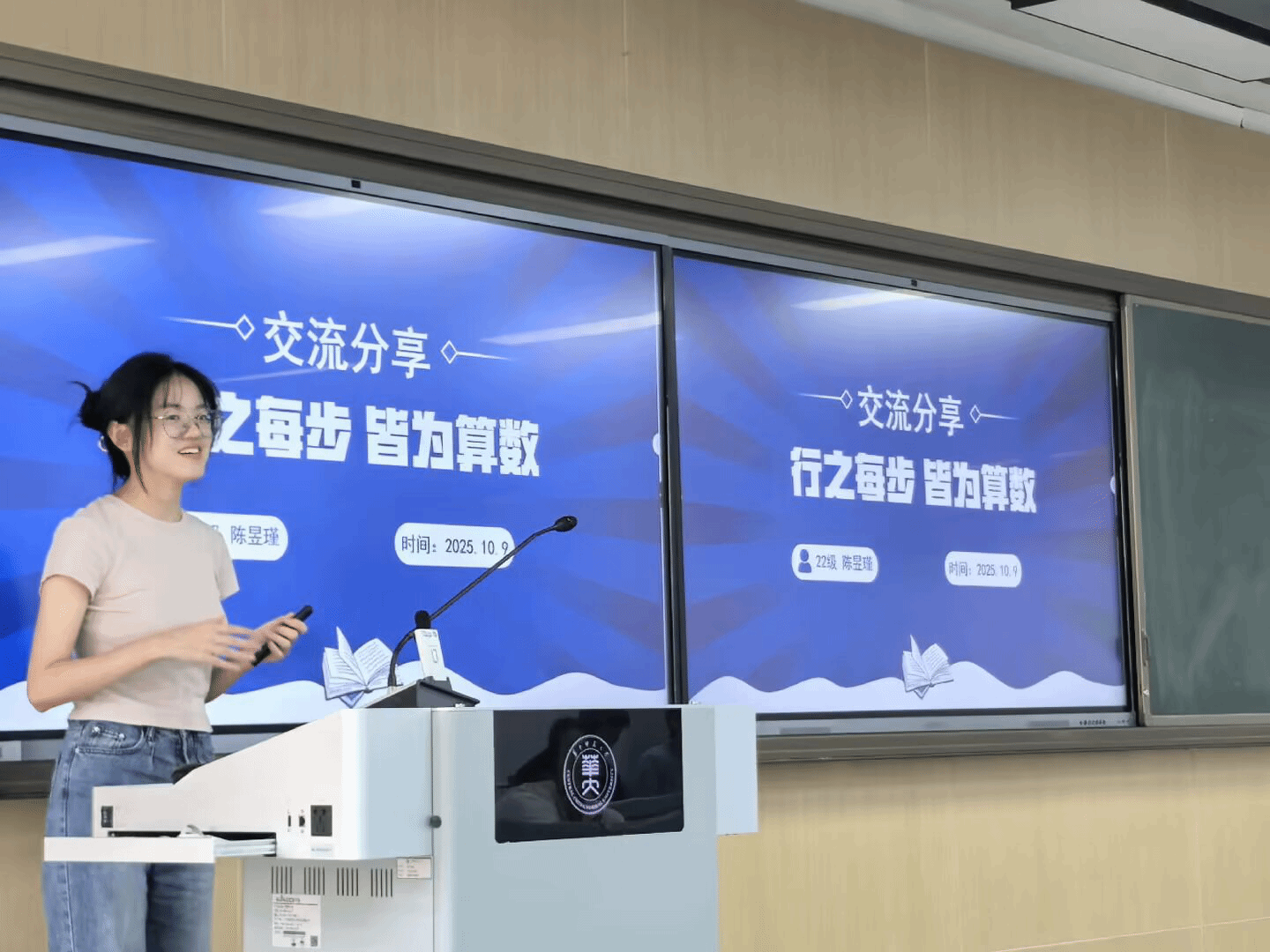 陈昱瑾以"行之每步,皆为算数"为主题展开分享。她通过辅修专业选择与教育实习准备等实际案例,阐释积累与坚持的重要意义,并在自由问答环节与同学们进行深入交流。